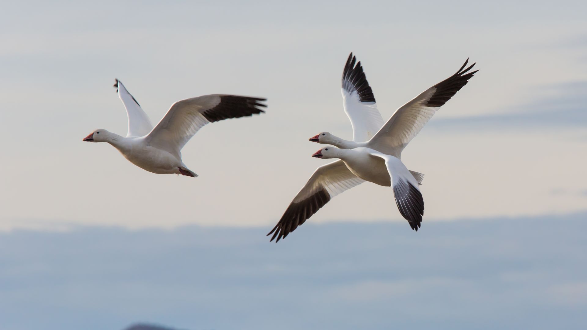 Three snow geese in flight. Photo: Jon G. Fuller/VWPics via Getty Images