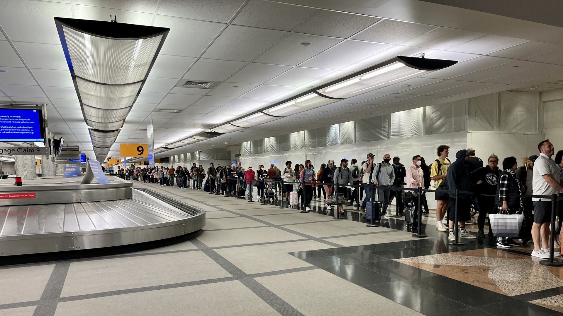 A security screening line extends past the baggage claims at Denver International Airport on May 17. Photo: Alayna Alvarez/Axios
