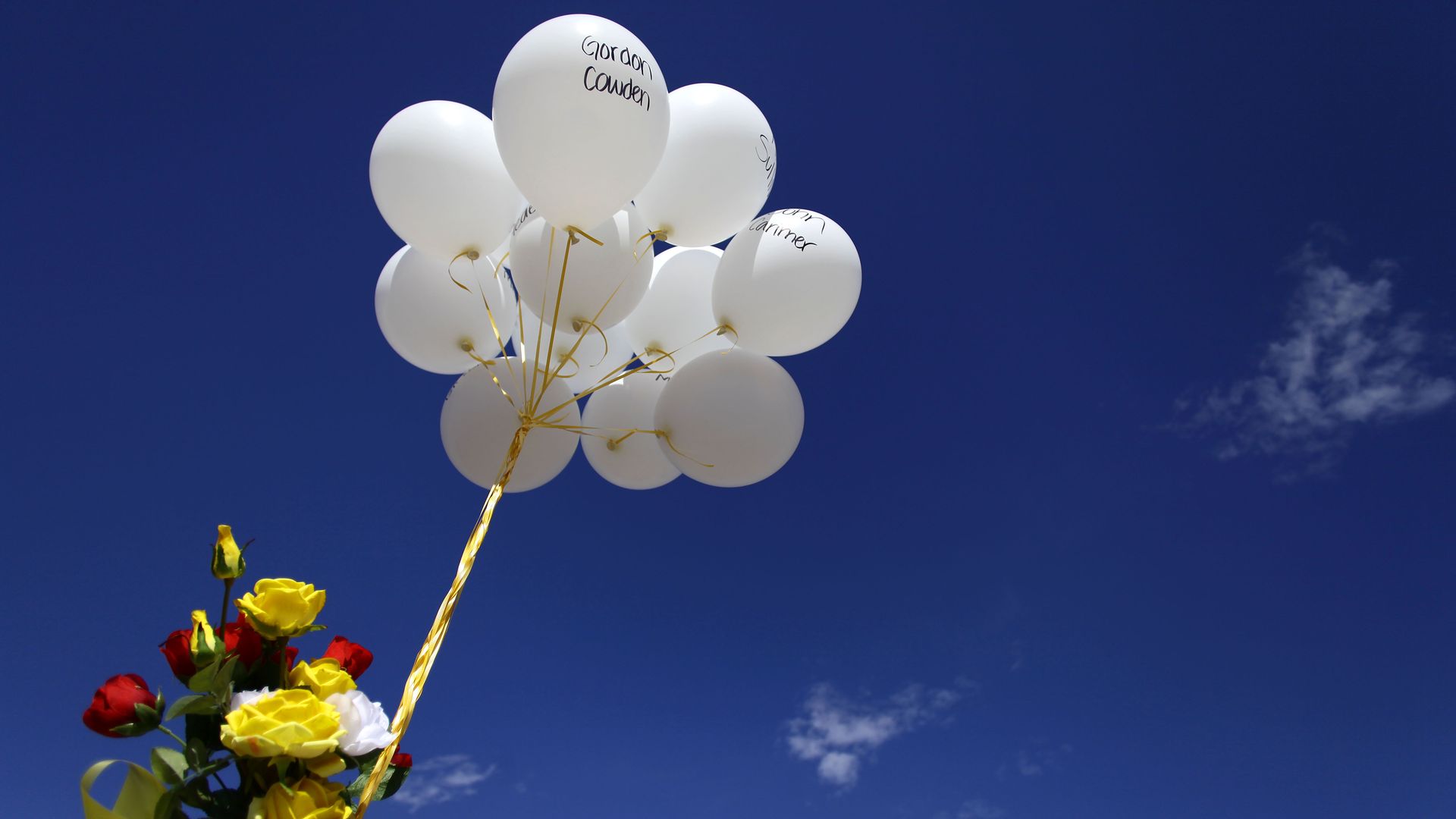 Balloons with the names of victims at a memorial across the street from Aurora's Century 16 movie theater in 2012. Photo: Joshua Lott/Getty Images