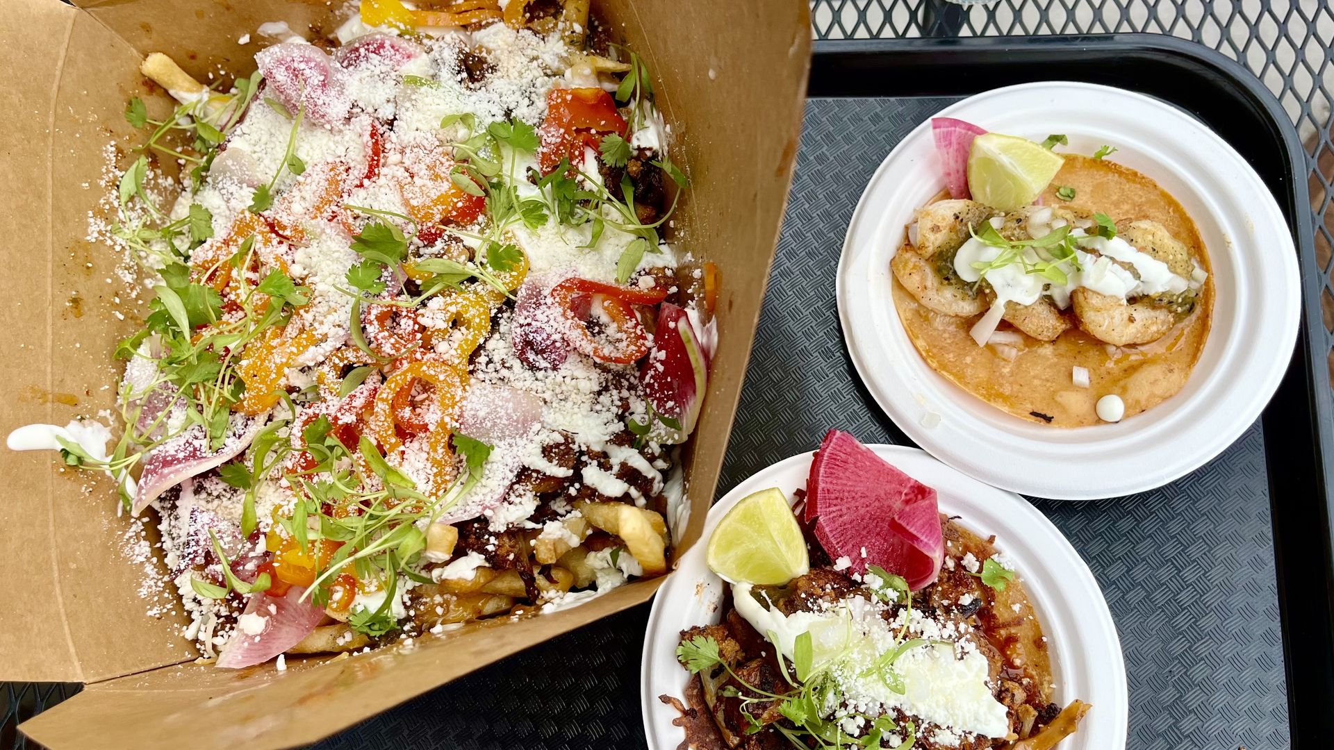 Left to right: The street fries, queso taco with cauliflower, and shrimp taco from Carrera's Tacos. Photo: Alayna Alvarez/Axios