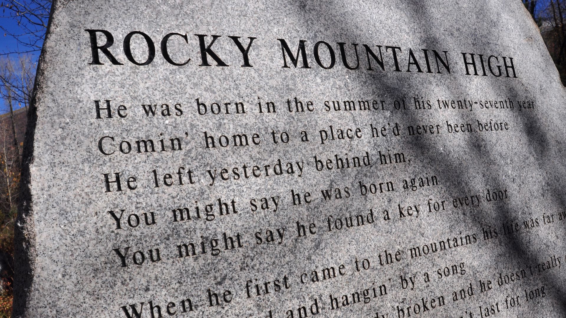 A granite boulder inscribed with lyrics from the John Denver song "Rocky Mountain High" at the John Denver Sanctuary in Aspen. Photo: Robert Alexander/Archive Photos/Getty Images