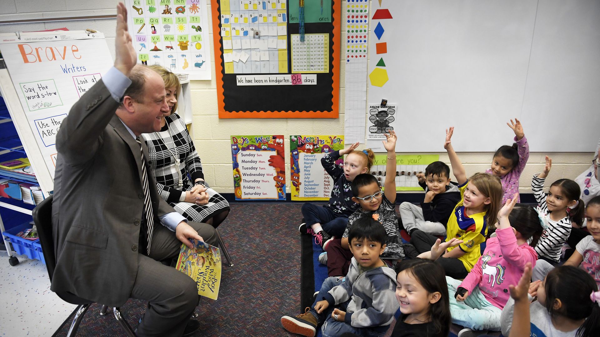 Gov. Jared Polis speaks to a kindergarten class during a tour of the school in January 2019. Photo: Joe Amon/The Denver Post via Getty Images