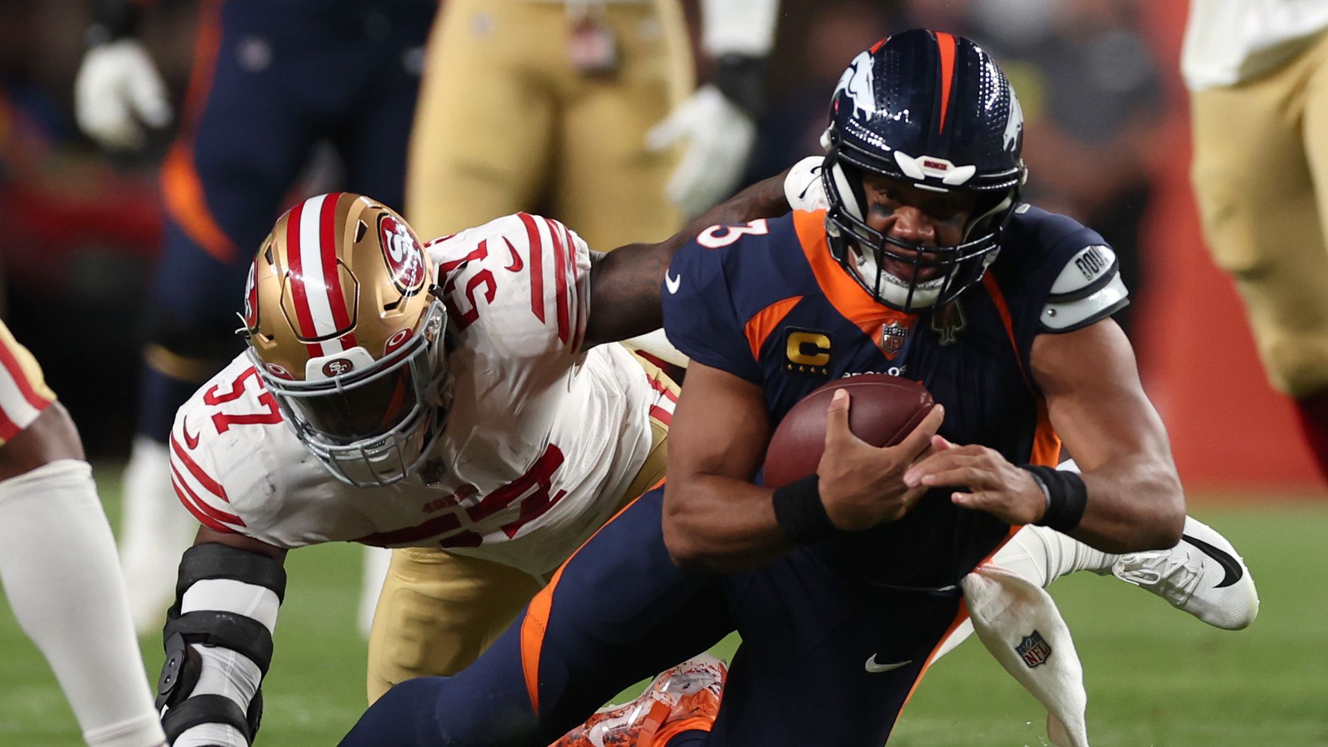 Russell Wilson attempts a run on Sept. 25 during the first half against the San Francisco 49ers at Empower Field at Mile High in Denver. Photo: Matthew Stockman/Getty Images