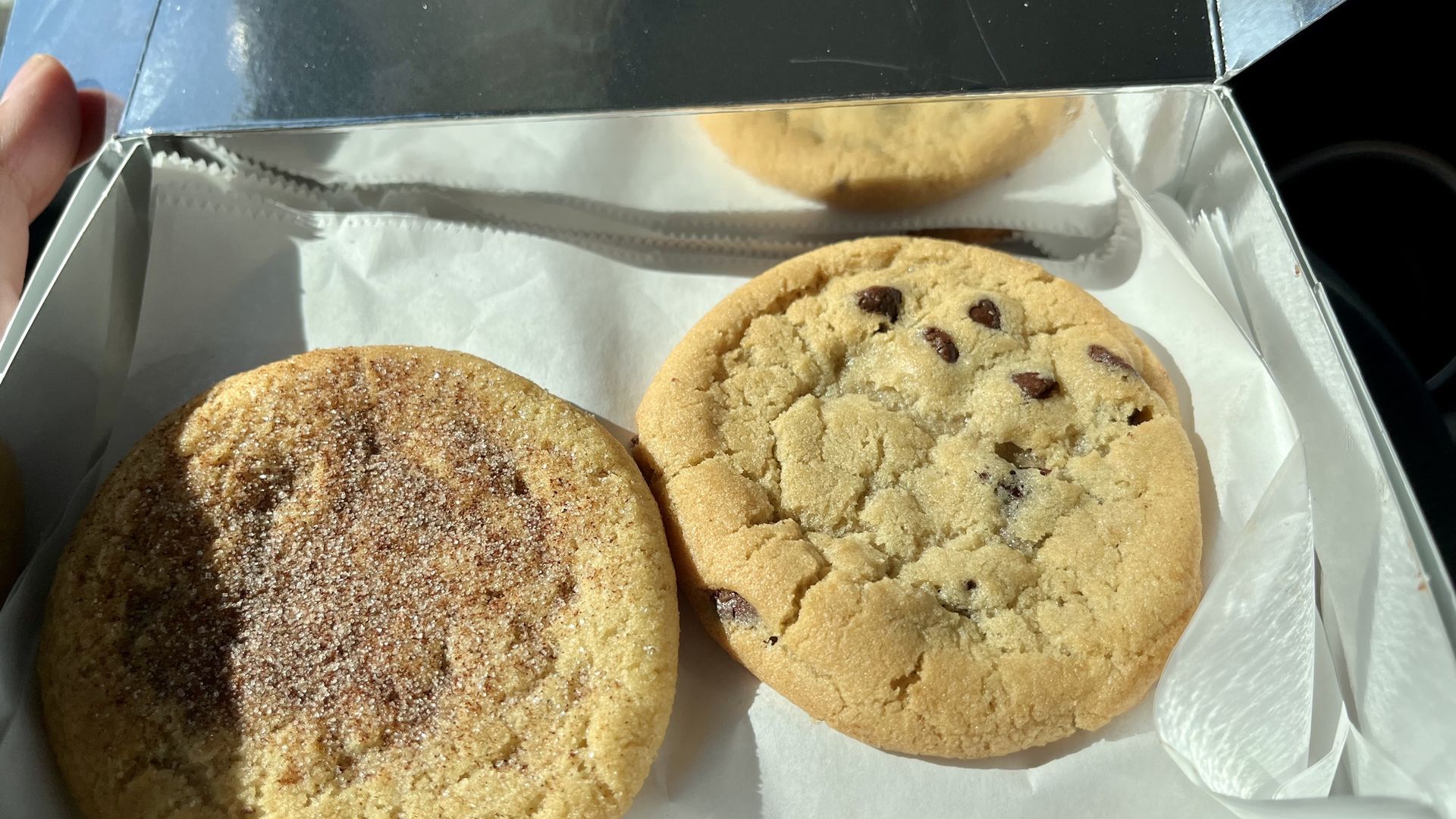 A warm snickerdoodle (L) and chocolate chip cookie from Tiff's Treats. Photo: Alayna Alvarez/Axios