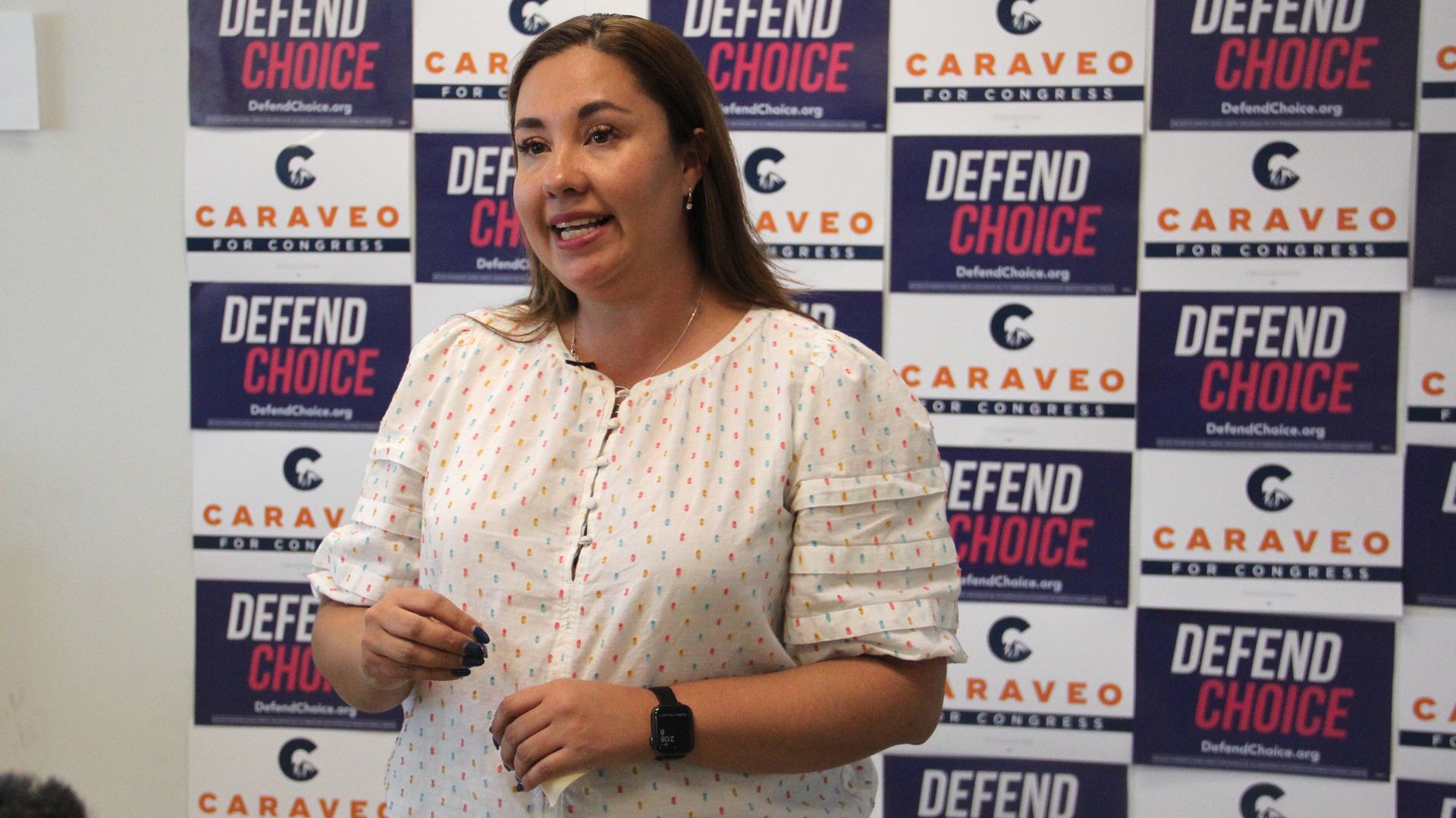 8th District candidate Yadira Caraveo, a Democrat, during a campaign event on Nov. 8. Photo: Esteban L. Hernandez/Axios Denver