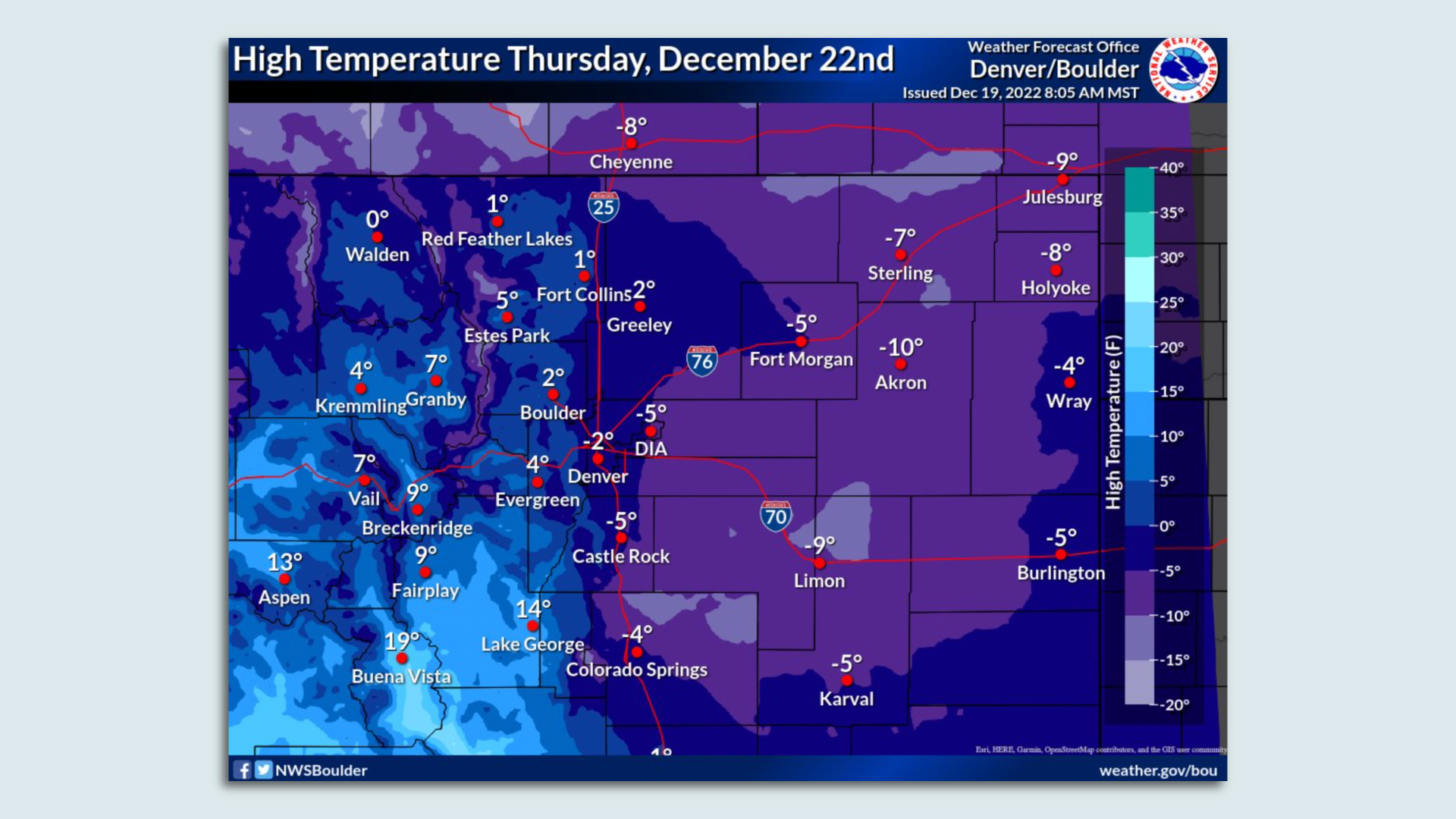 Colorado's high temperature forecast for Thursday. Photo: The National Weather Service