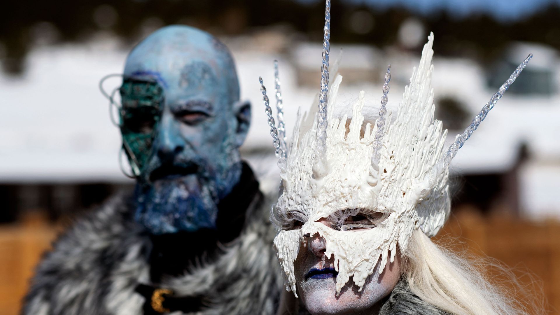 Karen Lichtfuss, dressed as the Ice Queen, stands in front of her husband Kurt during Frozen Dead Guy Days on March 19, 2022, in Nederland. Photo: Jason Connoll/AFP via Getty Images