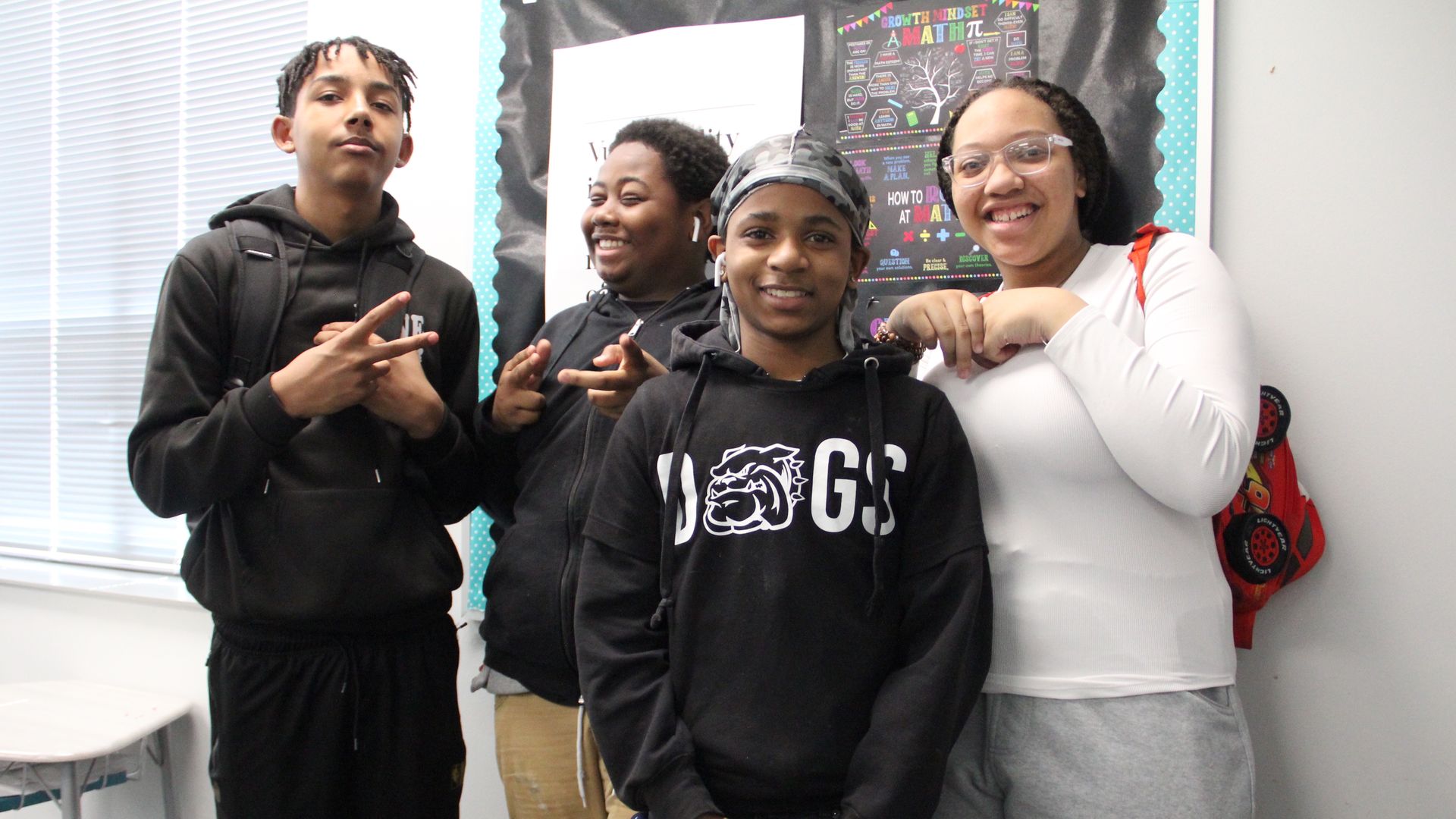 From left: Eighth graders Makhi Hardiman, Ja'sah Banks, Sincere Williams, and Dae Denzmore inside a classroom at DSST: Elevate Northeast Middle School on Friday in Denver. Photo: Esteban L. Hernandez/Axios