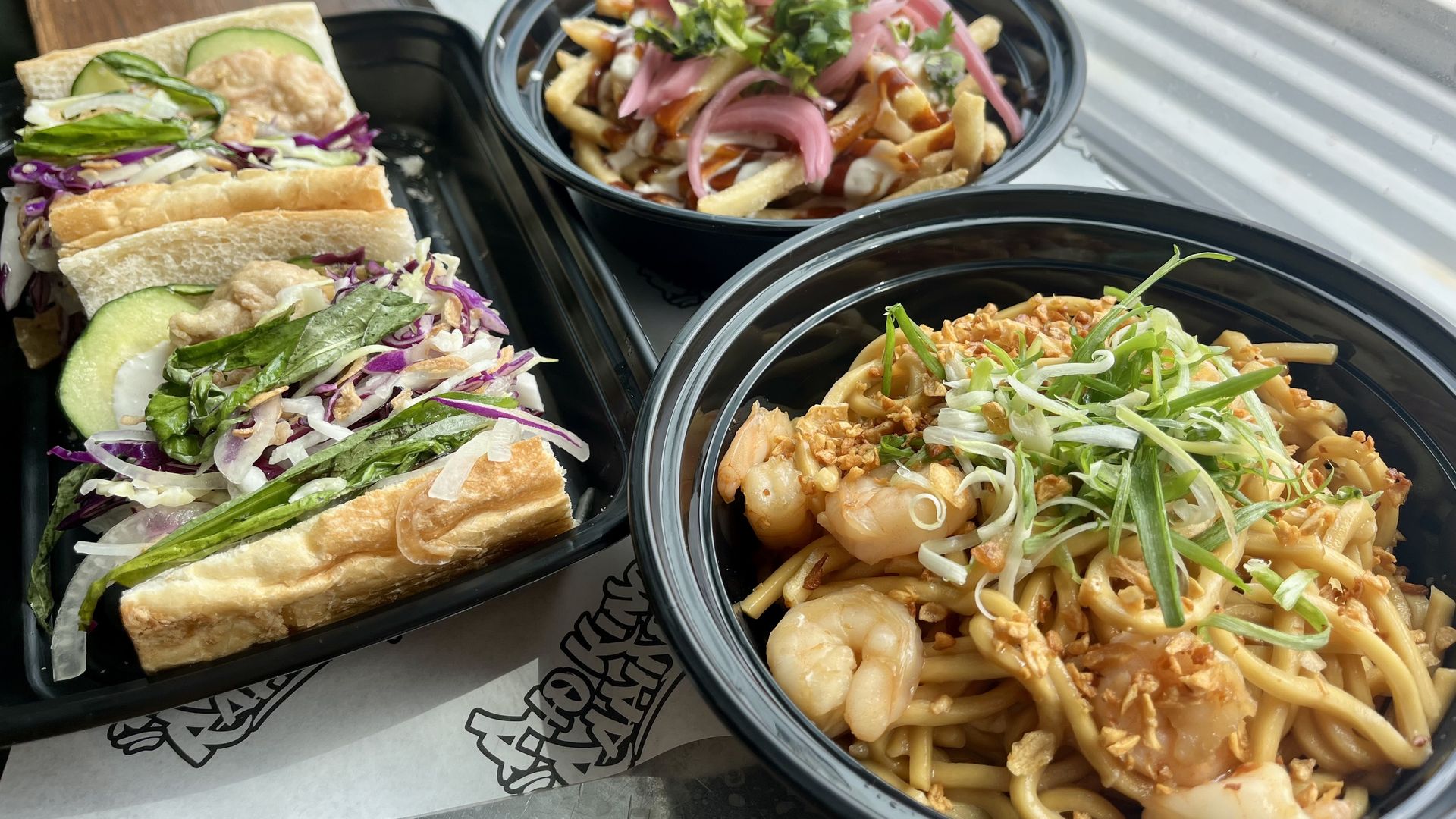Left to right: The chickie banh mi, party fries and garlic noods with shrimp from Pho King Rapidos at Avanti Food & Beverage. Photo: Alayna Alvarez/Axios