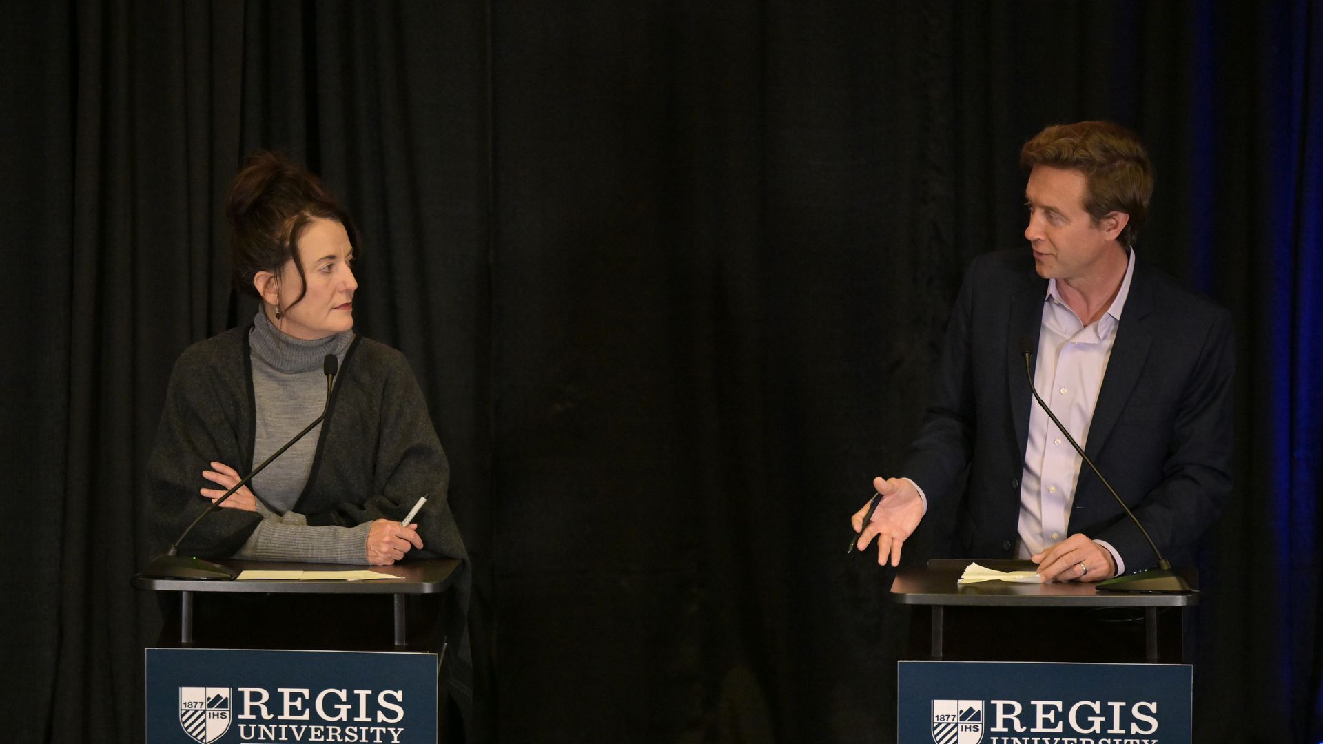 Kelly Brough and Mike Johnston during a Denver mayoral debate at Regis University on May 11. Photo: Hyoung Chang/The Denver Post via Getty Images