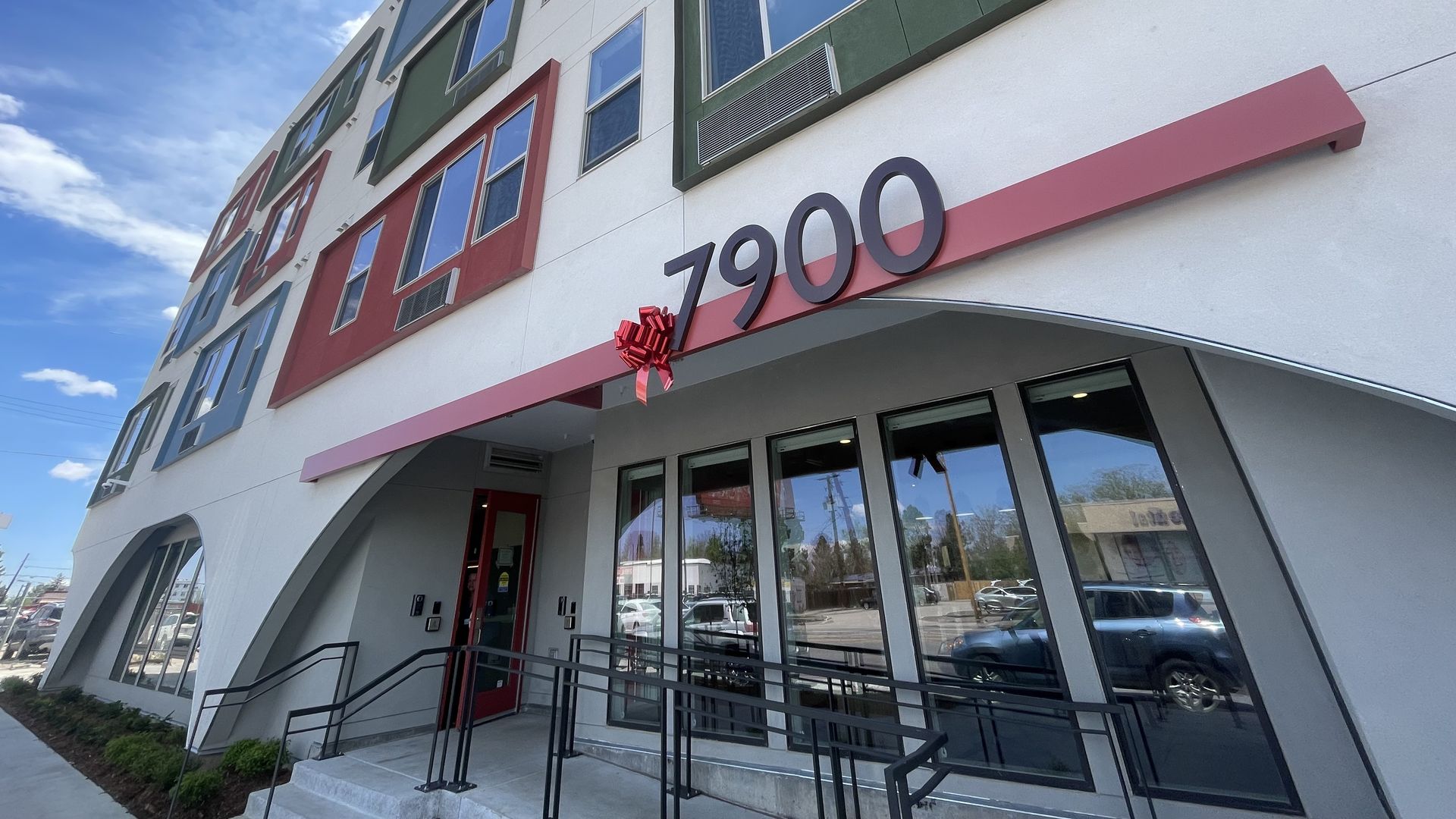 A bow is placed on the signage outside Valor on the Fax, an affordable housing complex in Denver's East Colfax neighborhood built with city funding. Photo: Esteban L. Hernandez/Axios