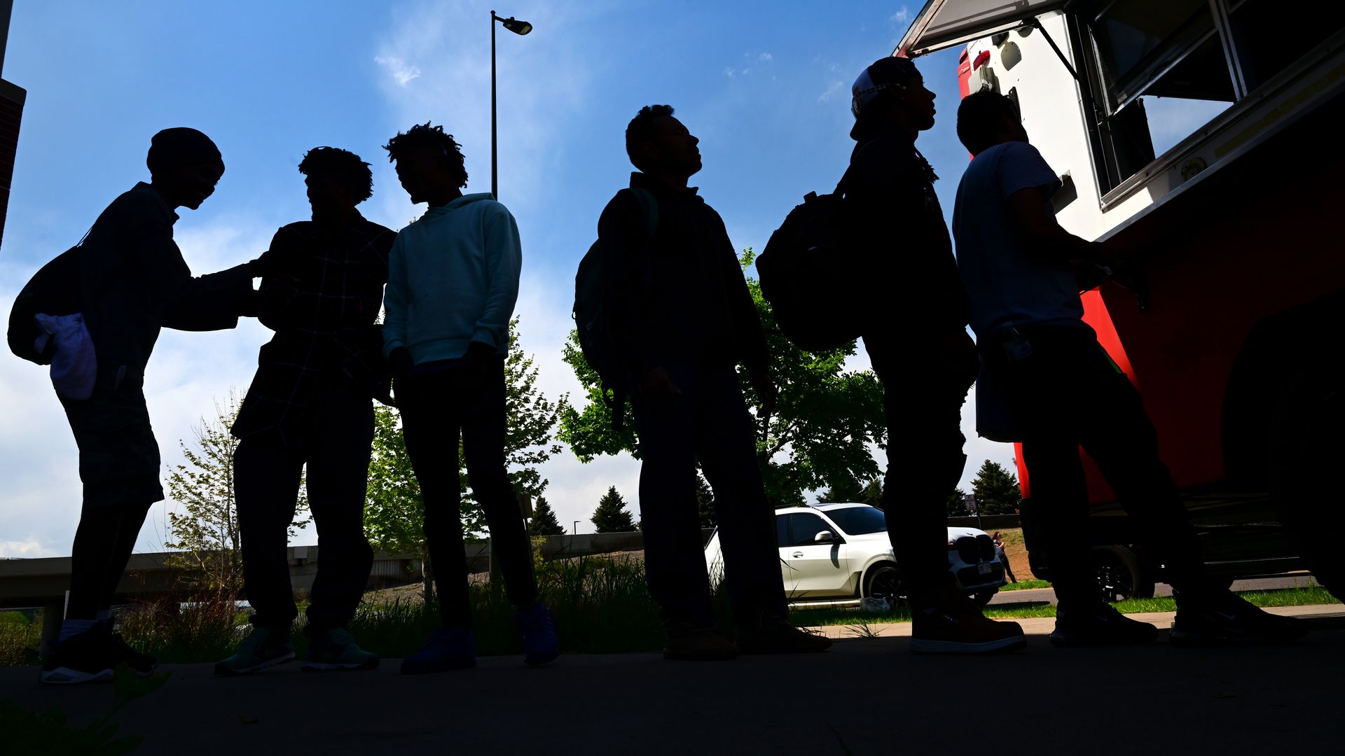 Venezuelan migrants wait in line at a food truck outside a migrant processing center last month in Denver. Photo: Helen H. Richardson/The Denver Post via Getty Images