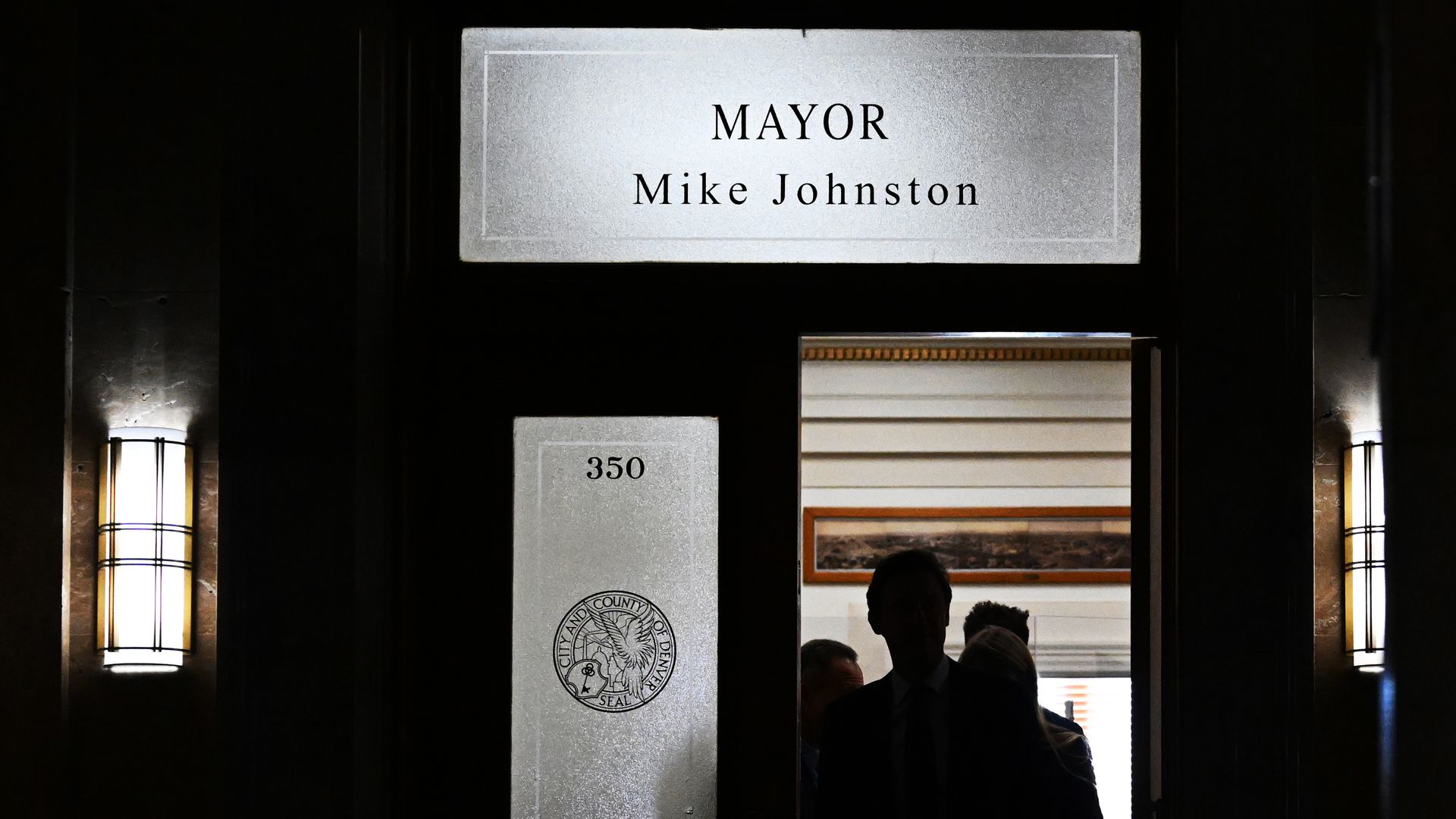 Denver Mayor Mike Johnston, center, leaves his office at the Denver City and County Building on Tuesday. Photo: RJ Sangosti/The Denver Post via Getty Images