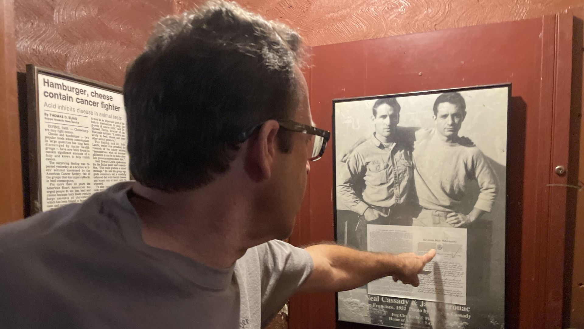 My Brother's Bar co-owner Dave Newman points to a copy of a 1944 letter written by Neal Cassady. Photo: Esteban L. Hernandez/Axios