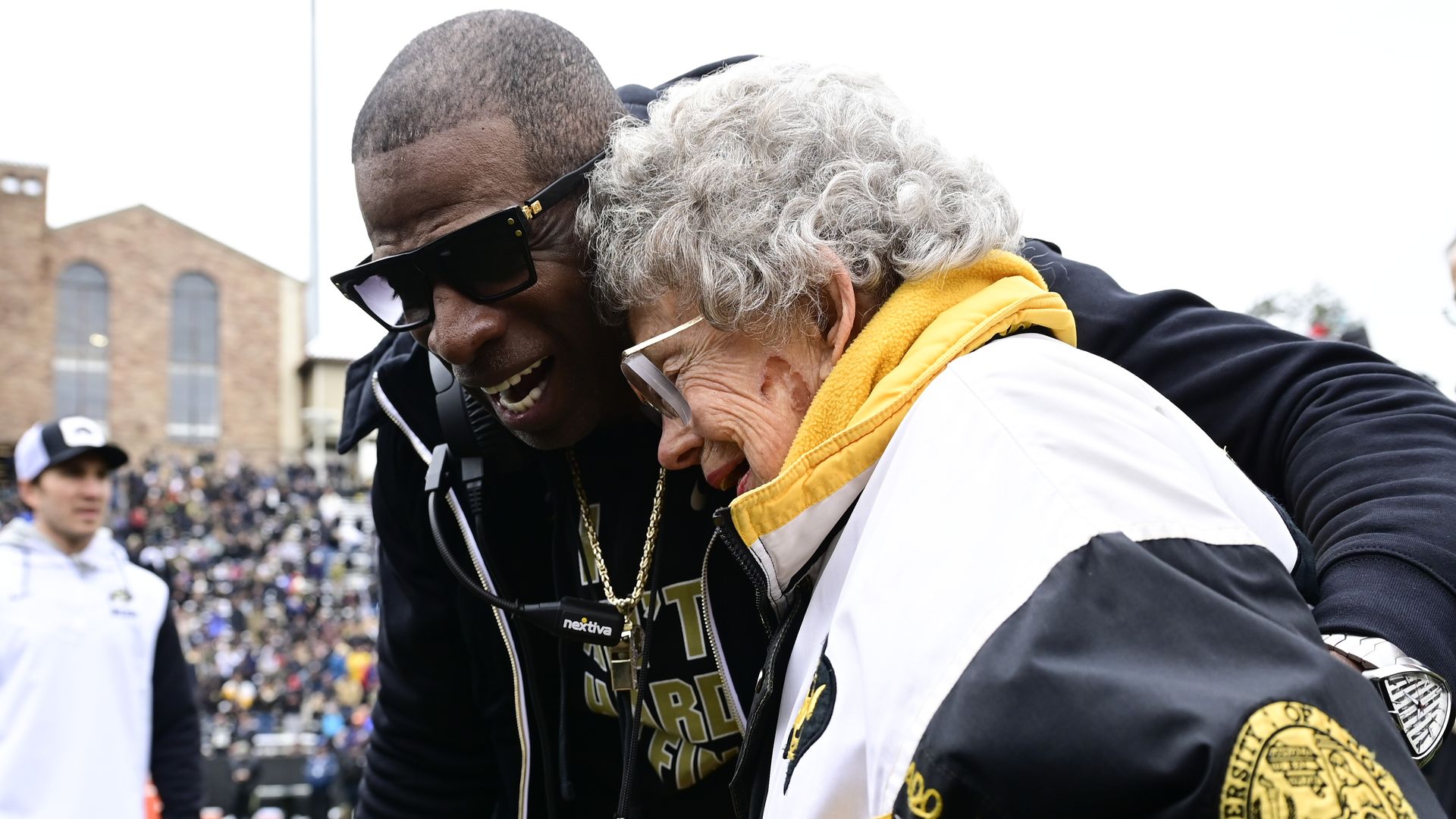 Colorado head coach Deion Sanders hugs super fan, Peggy Coppom, 98, before the Black and Gold game at Folsom Field on April 22 in Boulder. Photo: Andy Cross/MediaNews Group/The Denver Post via Getty Images