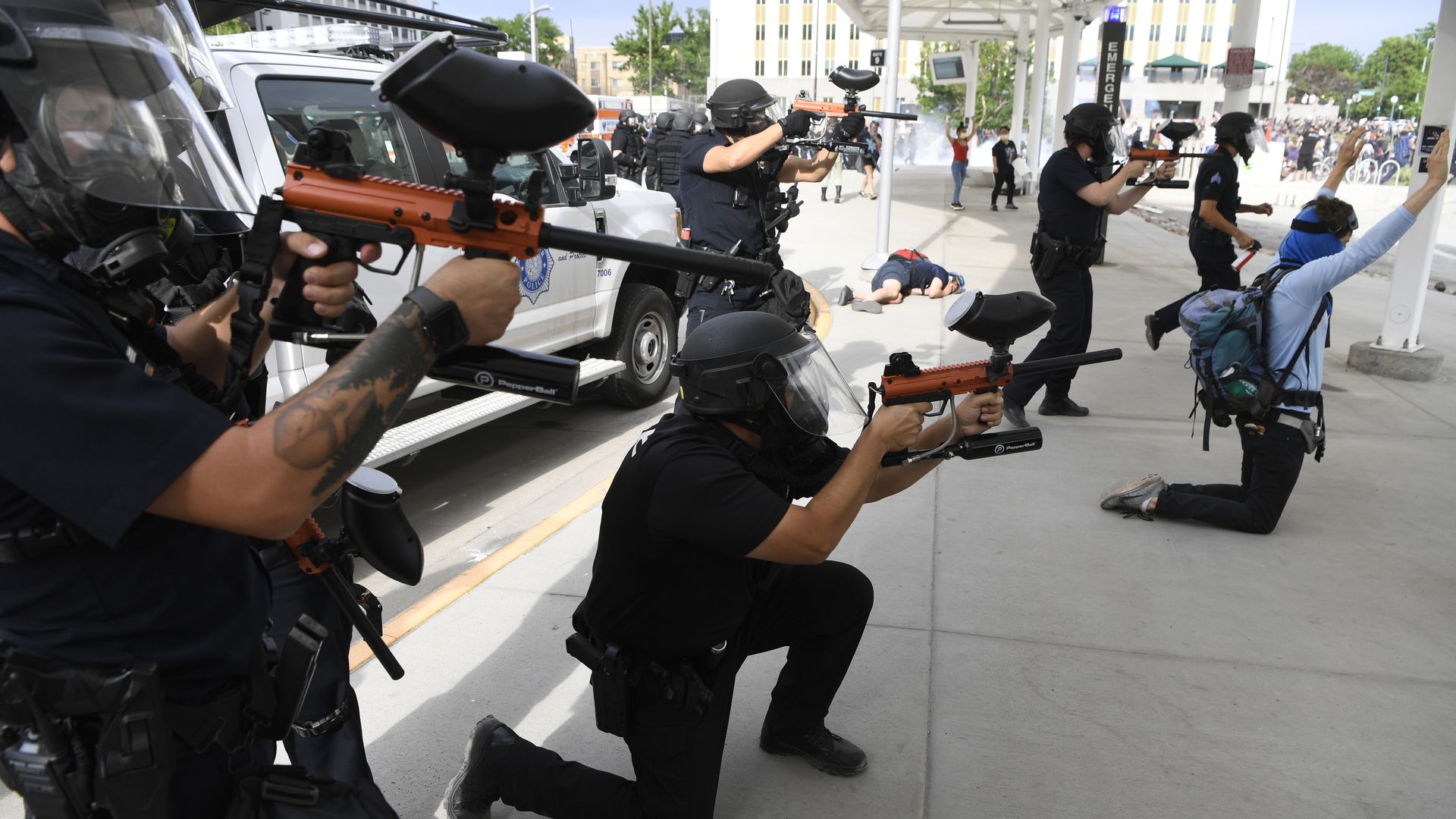 Law enforcement officers fire pepper balls into a crowd of protesters gathered near Colfax Avenue and Broadway on the third day of George Floyd protests in Denver on May 30, 2020. Photo: Andy Cross/The Denver Post via Getty Images