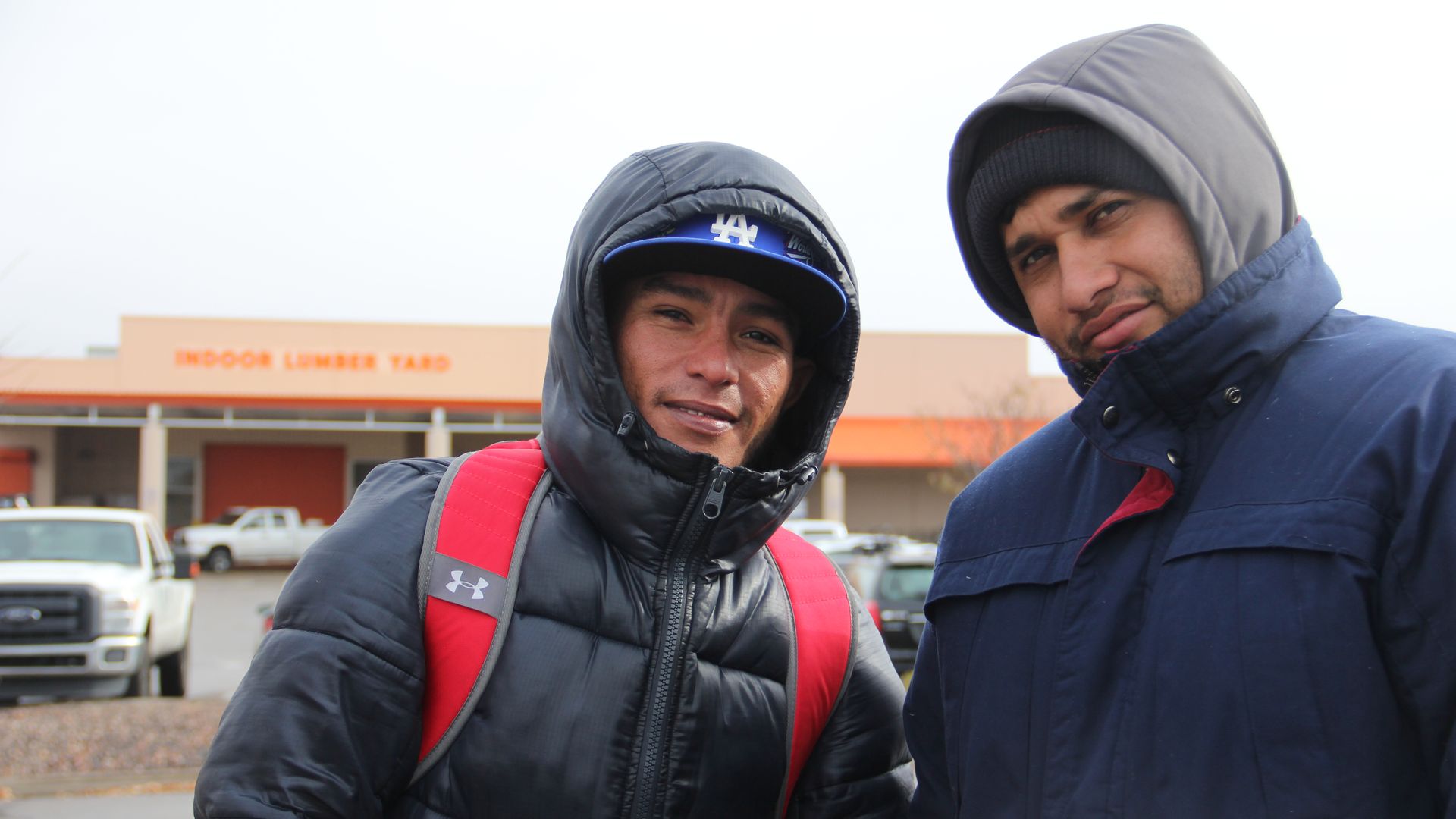 Yorvi Jose (left) and Luis Diaz pose for a photograph outside a Home Depot in Glendale, Colo. Photo: Esteban L. Hernandez/Axios