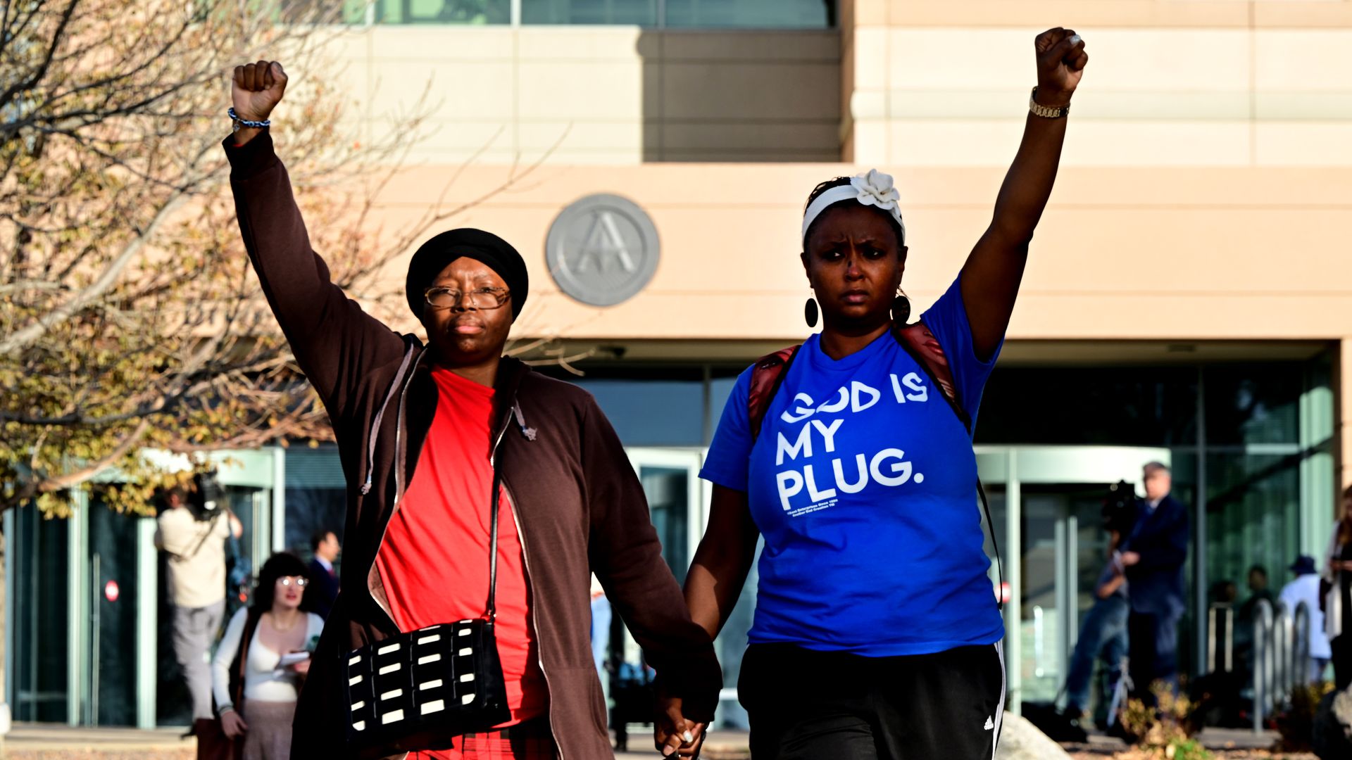 Elijah McClain's mother, Sheneen, left, holds up her fist in protest over the verdict outside of the Adams County Justice Center on Nov. 6 in Brighton. Photo: Helen H. Richardson/The Denver Post via Getty Images