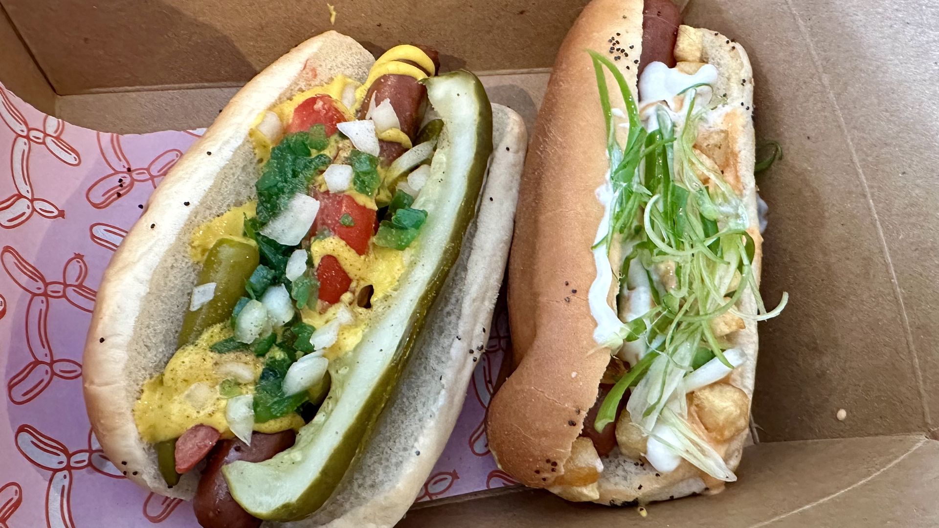 The Chicago dog and loaded potato dog from The Other Dog. Photo: Alayna Alvarez/Axios