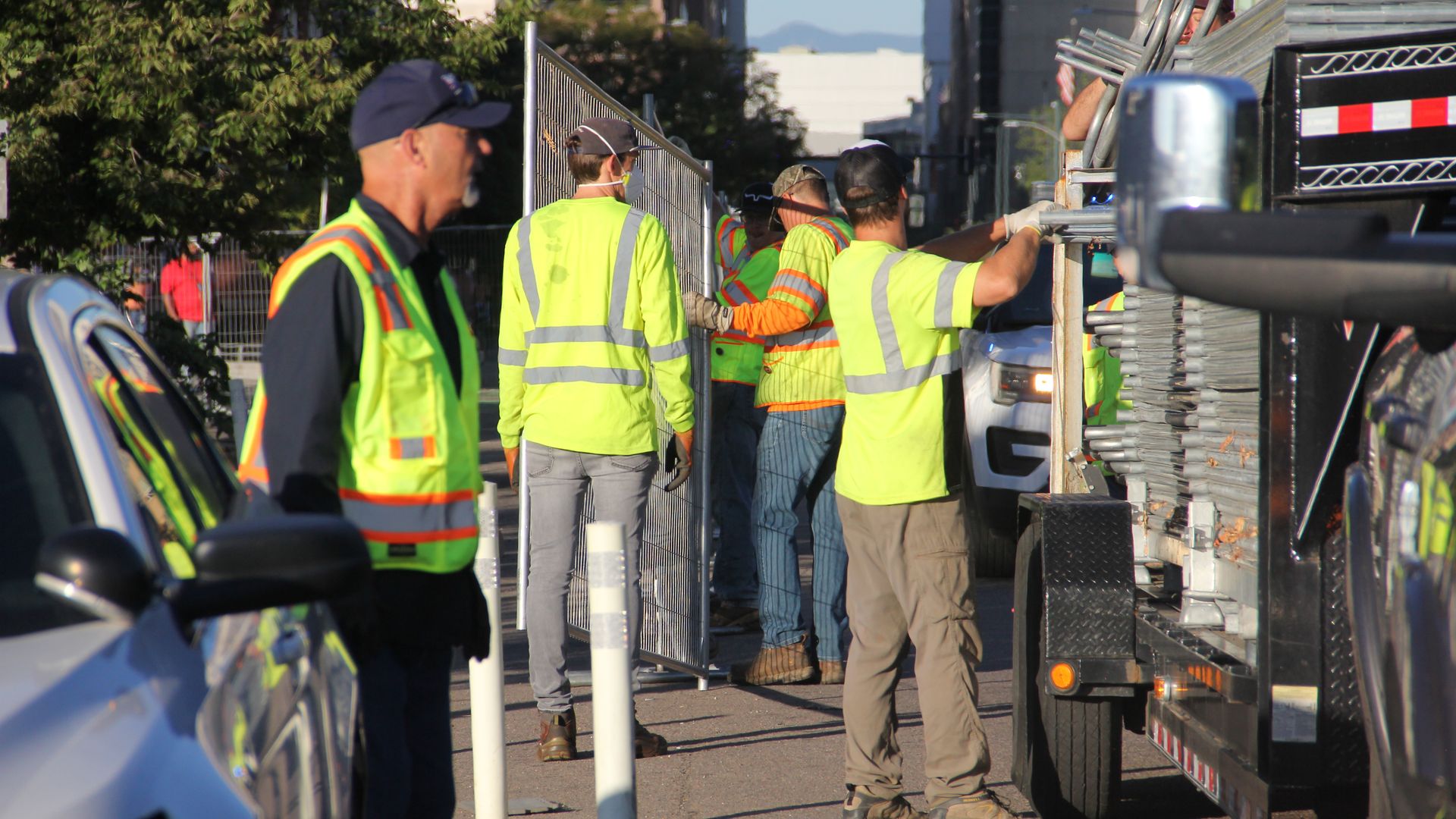 City staff erect a fence during a homeless encampment sweep in downtown Denver in August. Photo: Esteban L. Hernandez/Axios