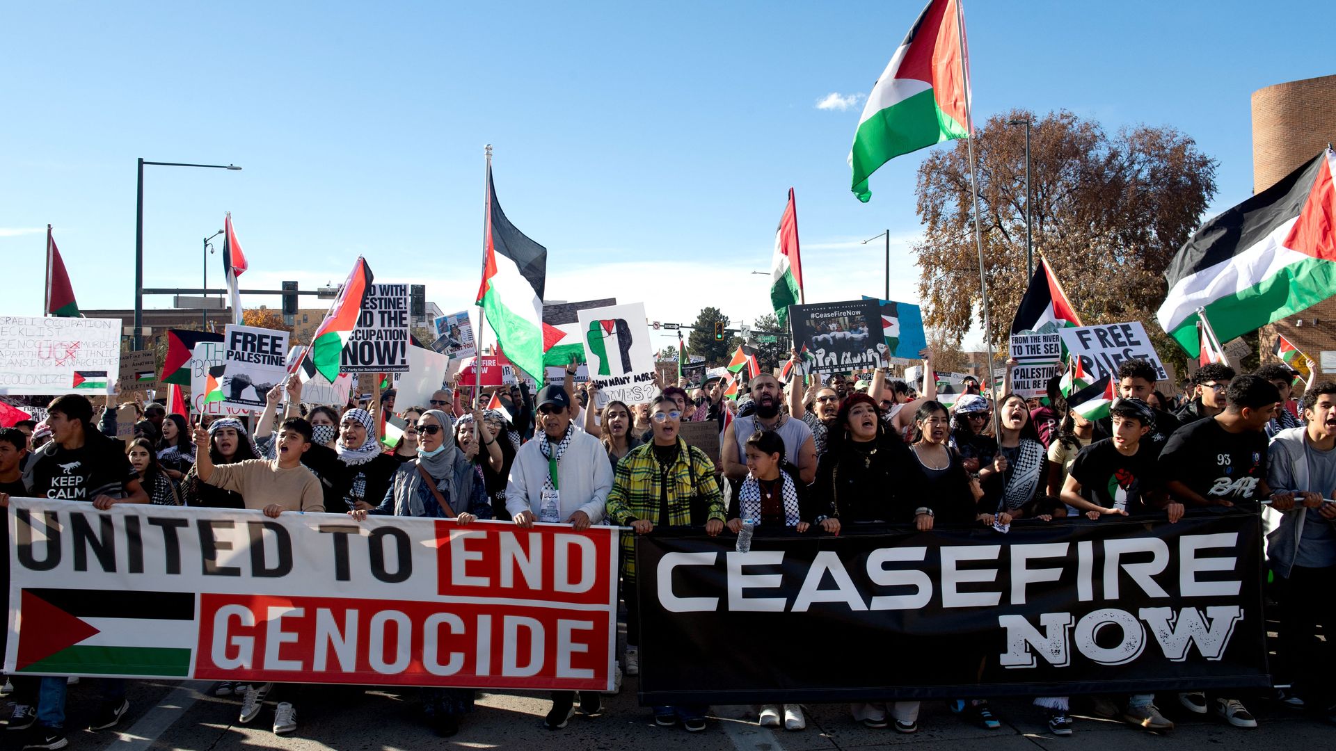Demonstrators march during a rally in support of Palestinians in Denver in November. Photo: Jason Connolly/AFP via Getty Images