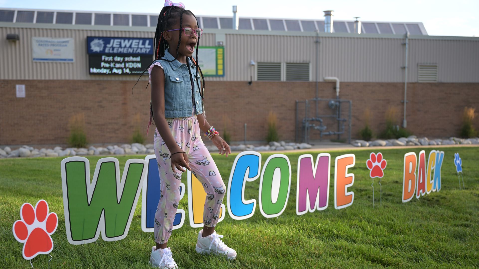 Saliyah Taylor, 7, celebrates her first day of school at Jewell Elementary School in Aurora in 2023. Photo: Hyoung Chang/The Denver Post via Getty Images