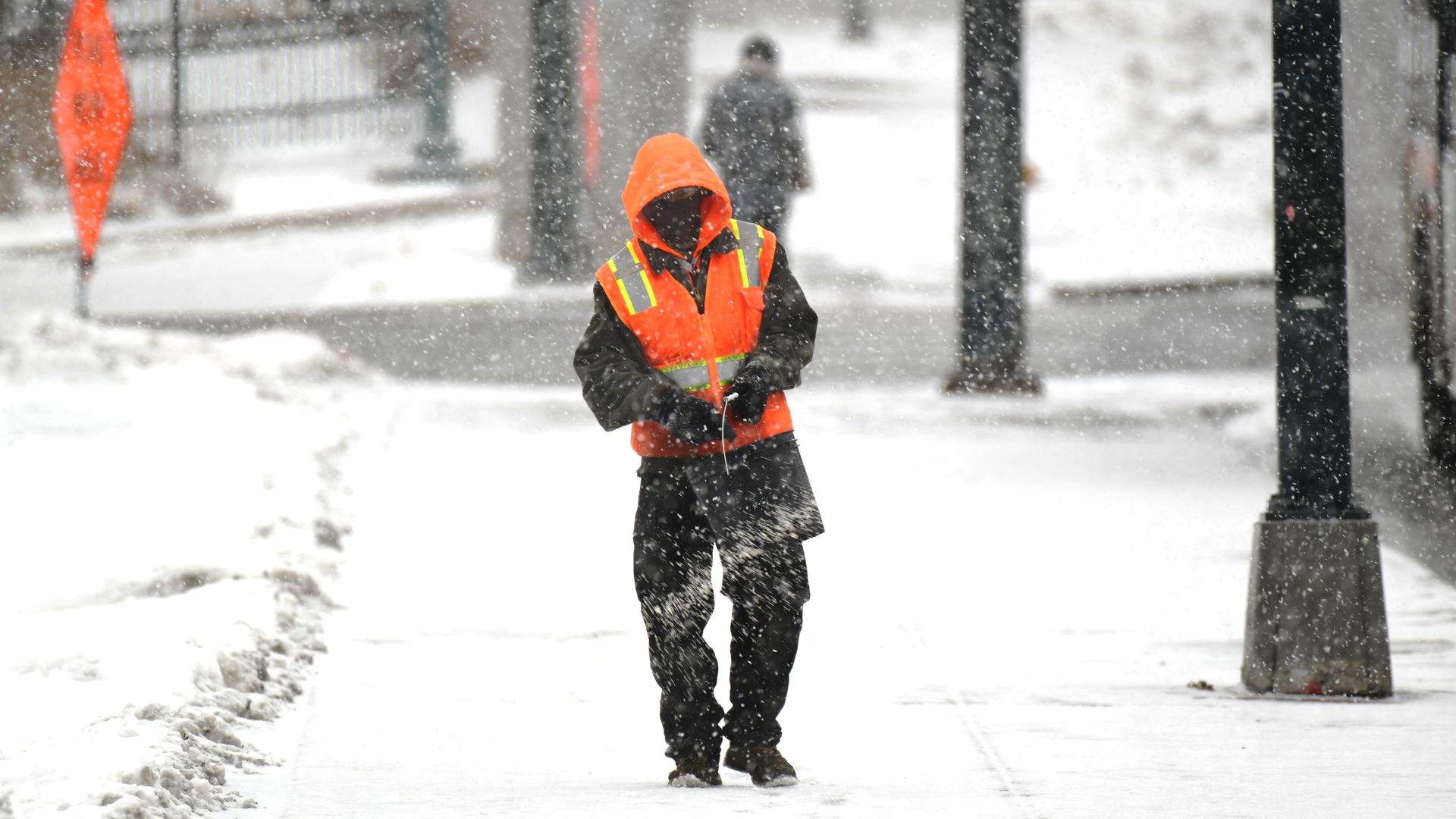 A Denver employee assists with snow operations around Civic Center Park on Jan. 27, 2022. Photo: Hyoung Chang/MediaNews Group/The Denver Post via Getty Images