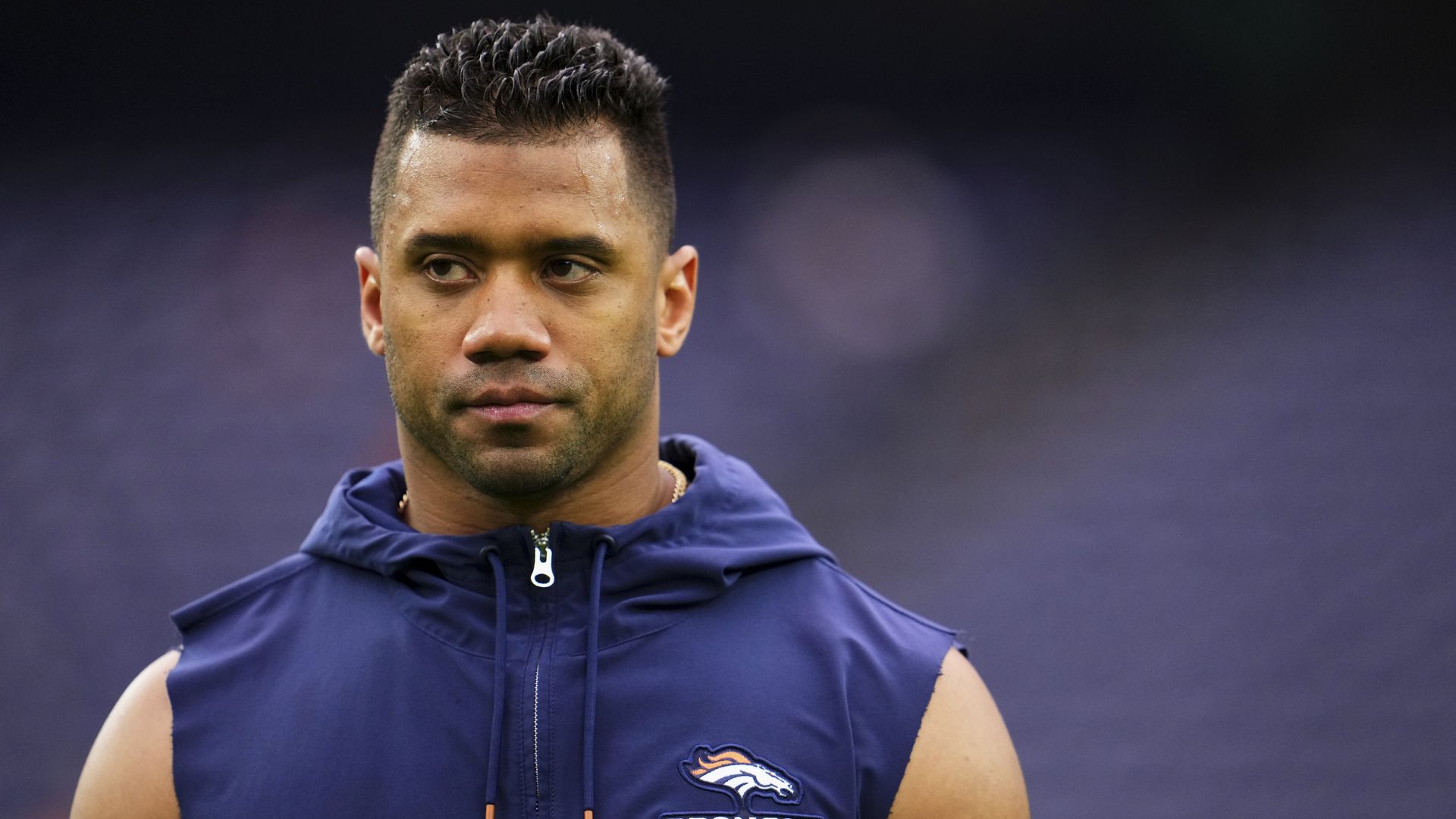 Former Denver Broncos quarterback Russell Wilson warms up before game on Dec. 3, 2023. Photo: Cooper Neill/Getty Images