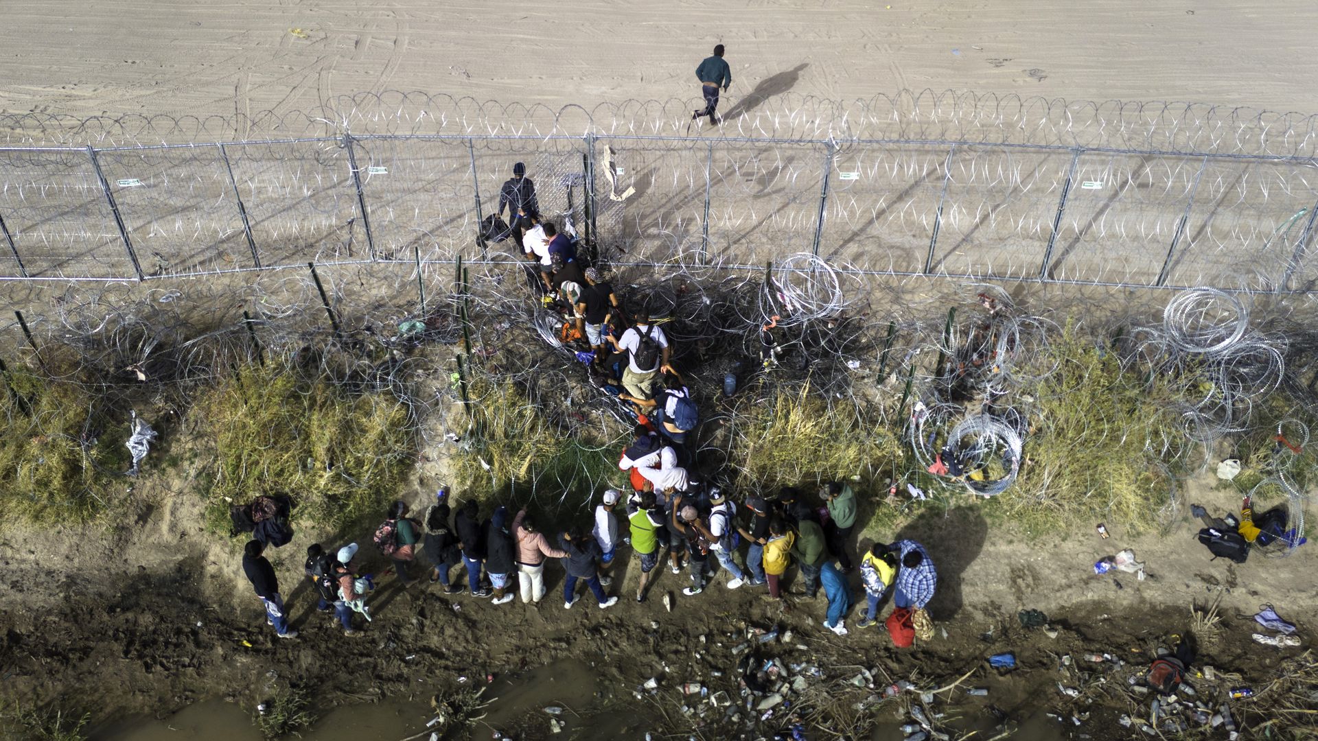 In an aerial view, immigrants pass through coils of razor wire while crossing the U.S.-Mexico border on March 13 in El Paso, Texas. Photo: John Moore/Getty Images