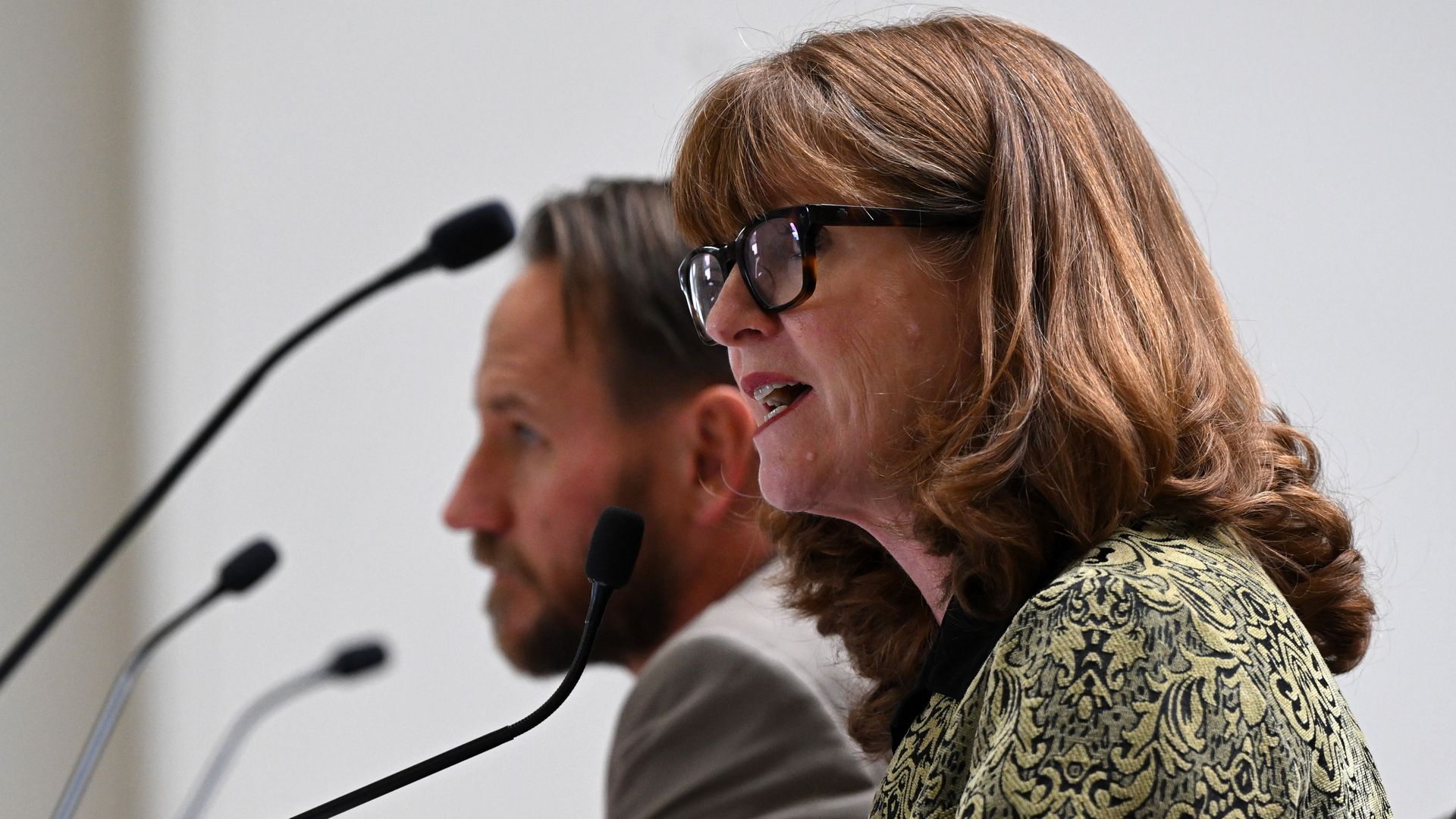 House Speaker Julie McCluskie and House Speaker Pro Tem Chris deGruy Kennedy speak at a legislative hearing in November. Photo: Helen H. Richardson/The Denver Post via Getty Images