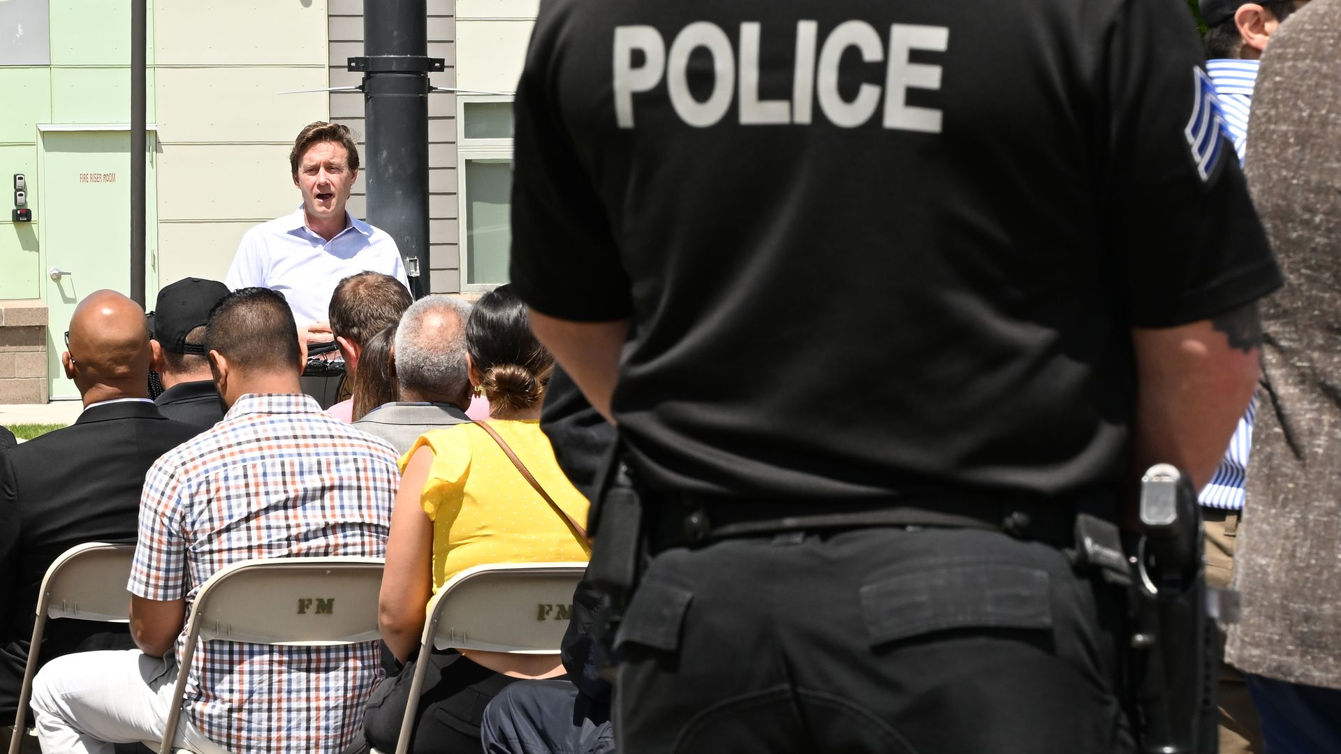 A Denver police officer listens during a news briefing from Mayor Mike Johnston on May 13. Photo: RJ Sangosti/The Denver Post via Getty Images