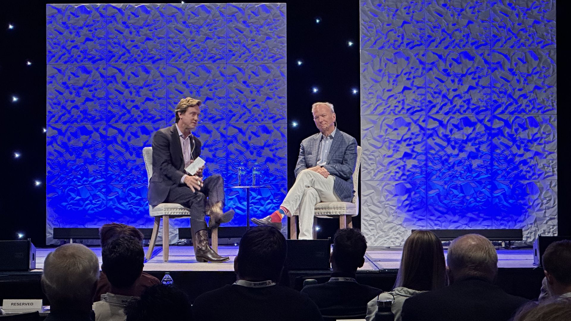 Denver Mayor Mike Johnston (left) and former Google CEO Eric Schmidt at the DenAI Summit Thursday. Photo: Alayna Alvarez/Axios