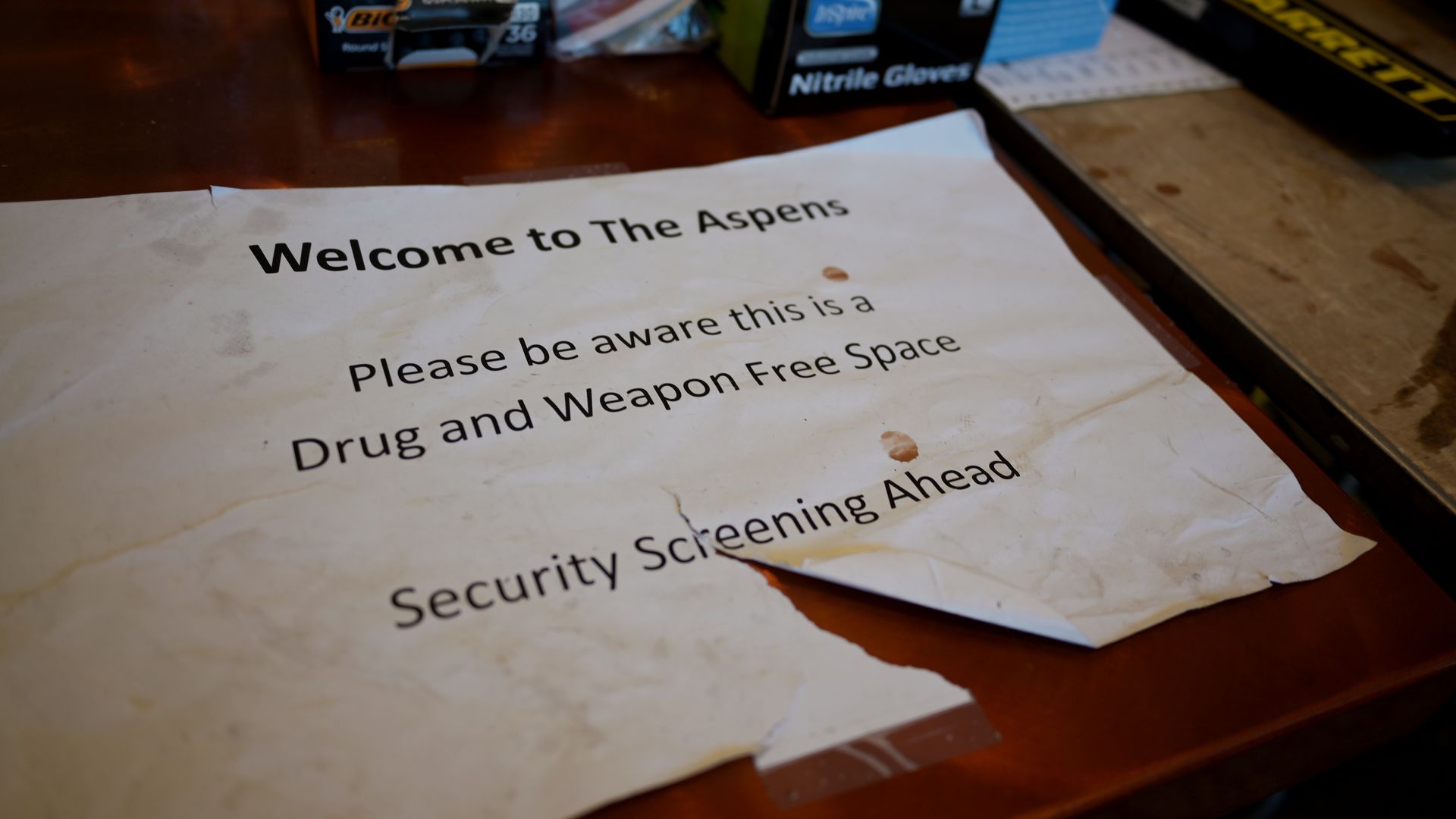 A sign at the main entrance of the Aspens — a homelessness shelter in Denver and the site of a double homicide in March — pictured in April 2024. Photo: Hyoung Chang/The Denver Post via Getty Images