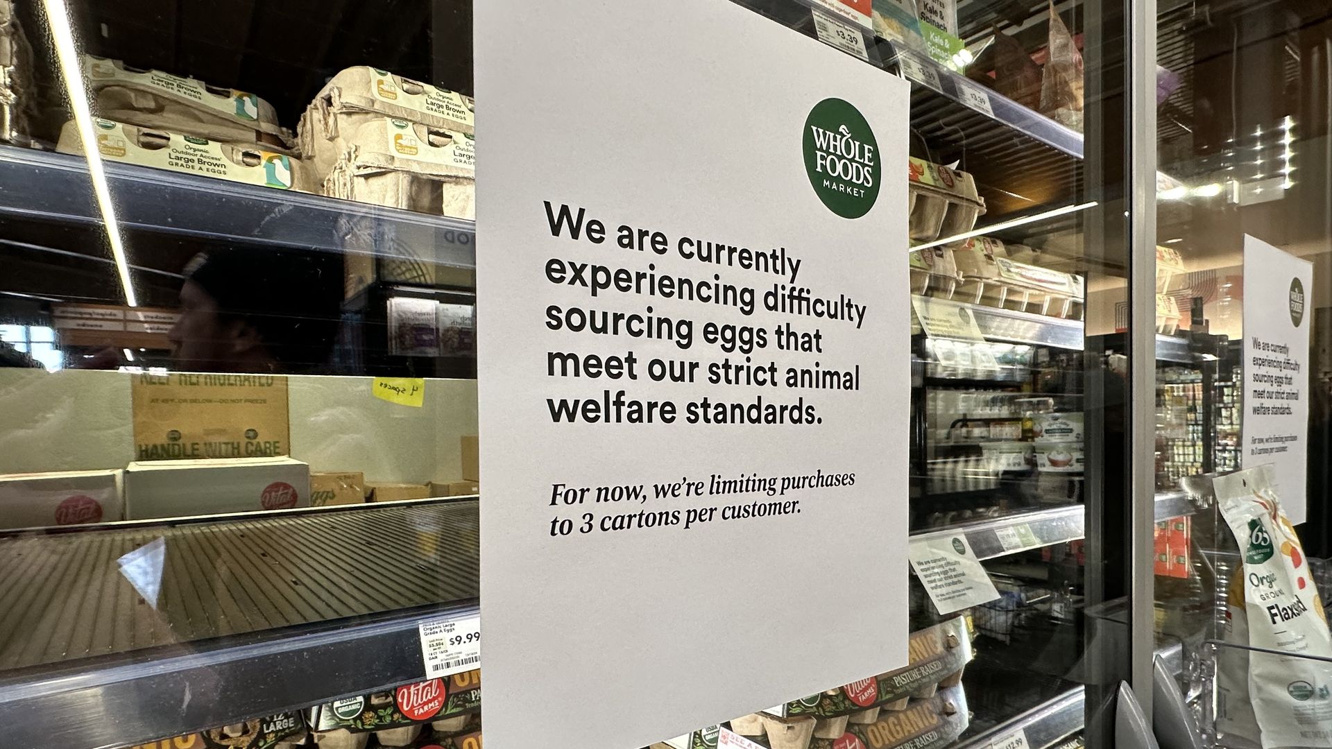 A sign at the Whole Foods at 900 E. 11th Ave. in Denver on Jan. 19, limiting three cartons per purchase. Photo: Alayna Alvarez/Axios
