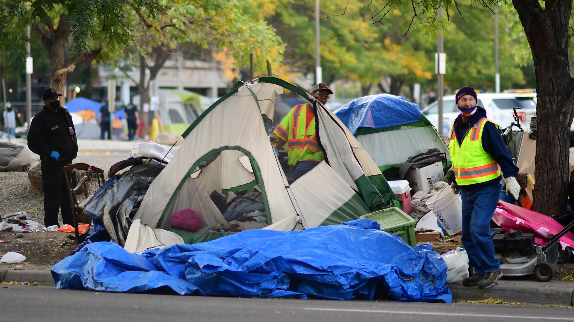 Denver city crews sweep the encampment site near 14th Avenue and Logan Street in October 2020. Photo: Hyoung Chang/MediaNews Group/The Denver Post via Getty Images