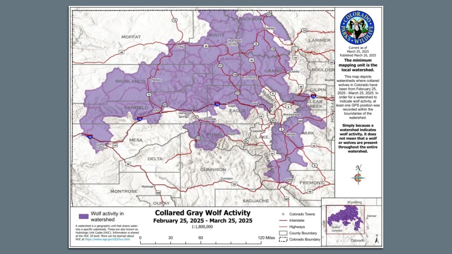 A map showing where Colorado wolves have traveled in the state between Feb. 25 and March 25. Map: Courtesy of Colorado Parks and Wildlife