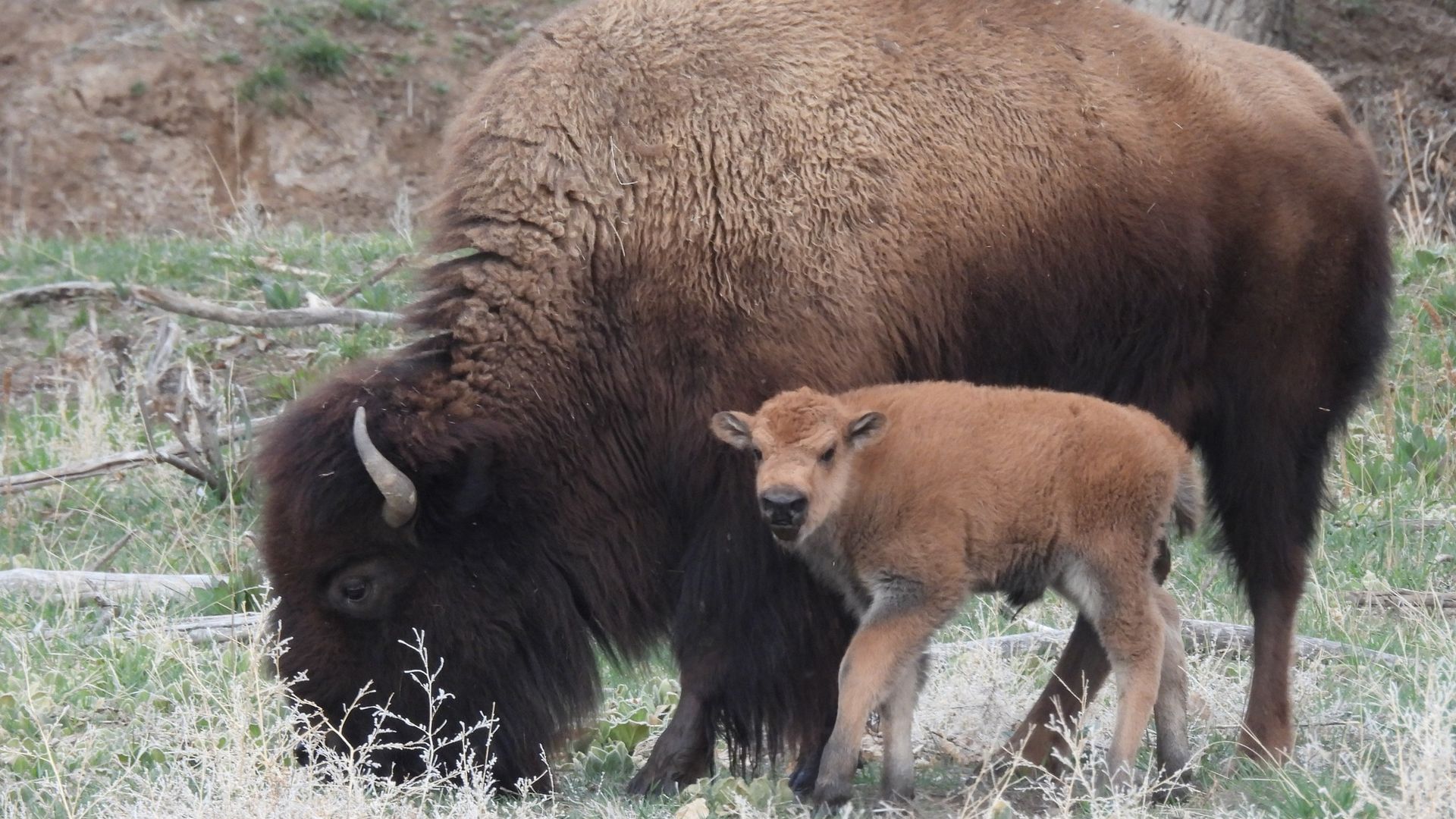 Rocky Mountain Arsenal's new bison calf and mom. Photo: L & R Steiner/USFWS Volunteers