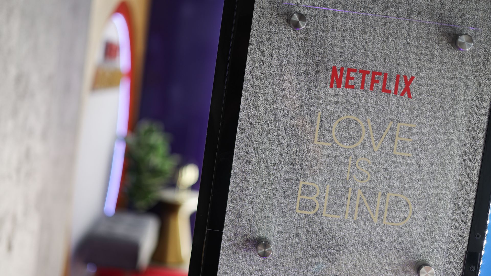 A "Love Is Blind" sign at a watch party in Hollywood. Photo: John Salangsang/Variety via Getty Images