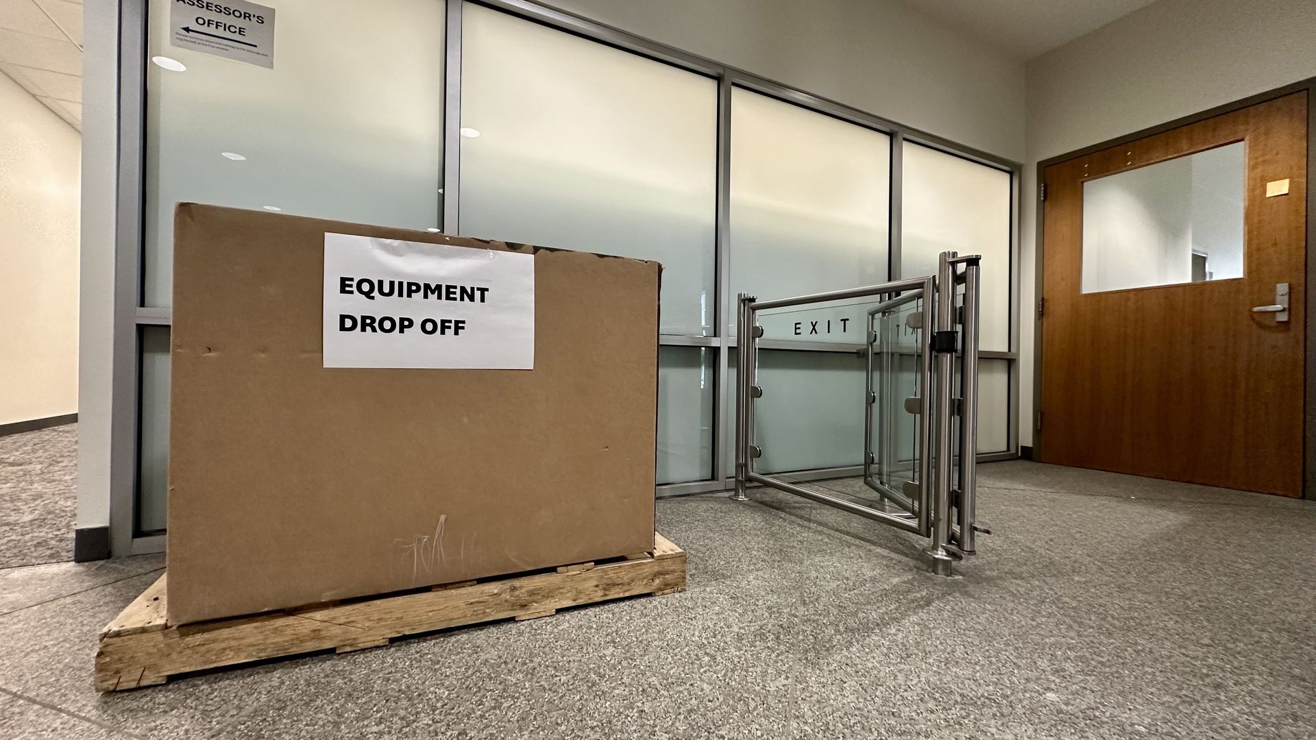 A drop-off box for laid-off Denver city employees to return their work equipment sits in the lobby of the Wellington E. Webb Municipal Office Building on Monday. Photo: Alayna Alvarez/Axios