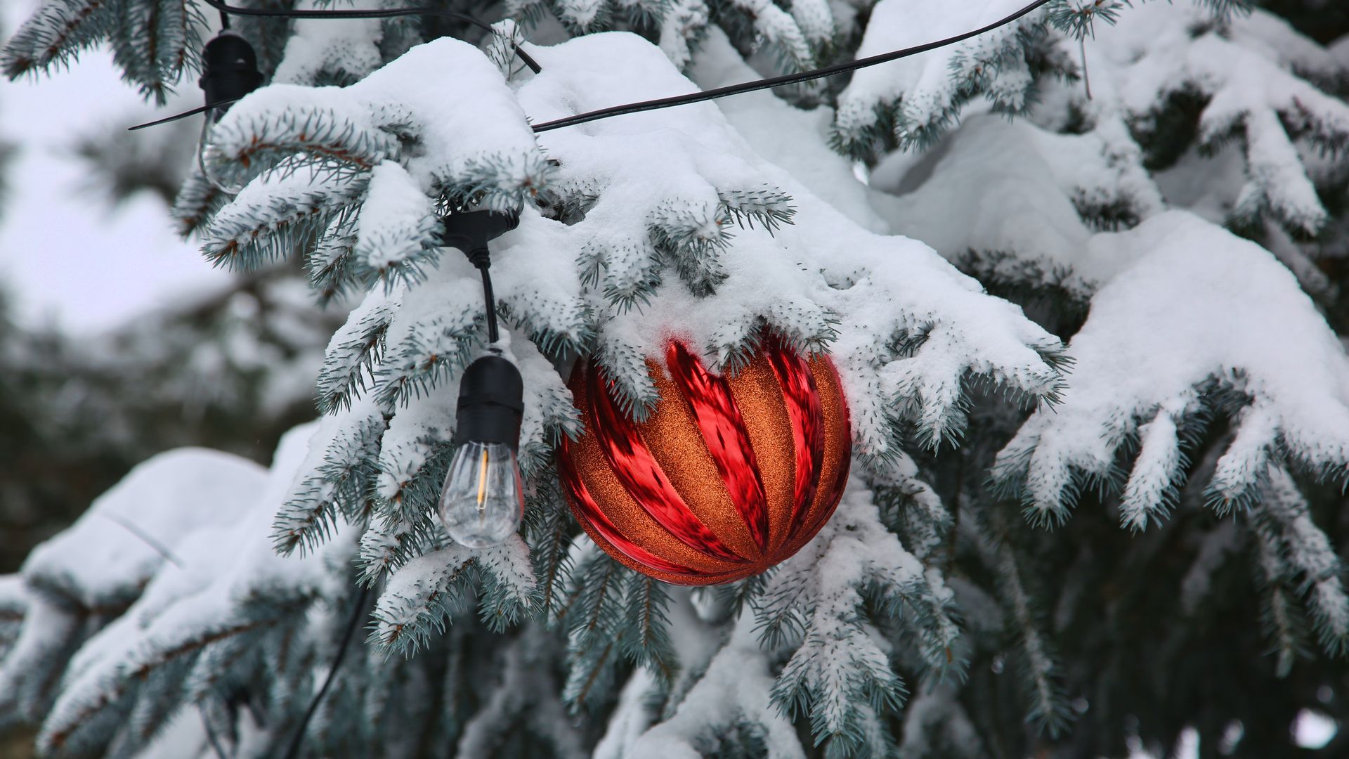 A Christmas ornament hangs on a snow spruce tree. Photo: Creative Touch Imaging Ltd./NurPhoto via Getty Images