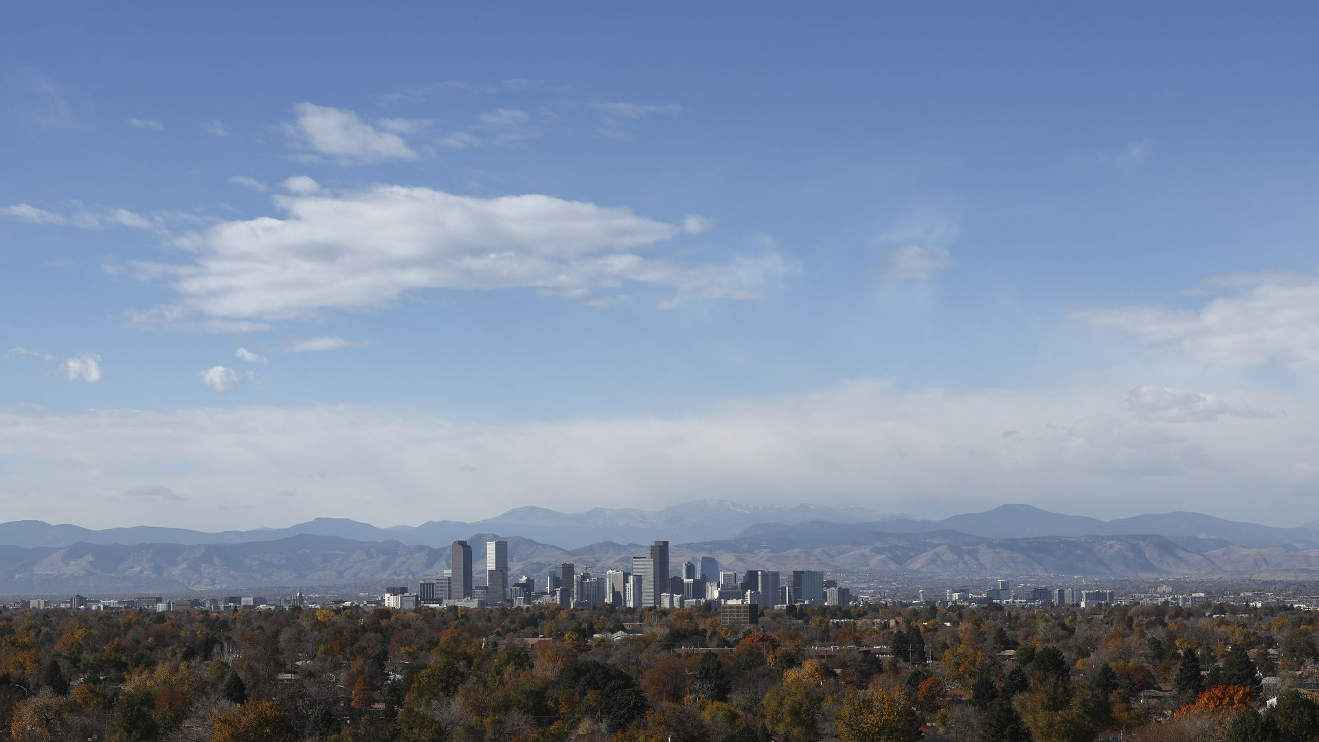 The Denver skyline stands against the Rocky Mountains on a sunny November day. Photo: Aaron M. Sprecher/Getty Images