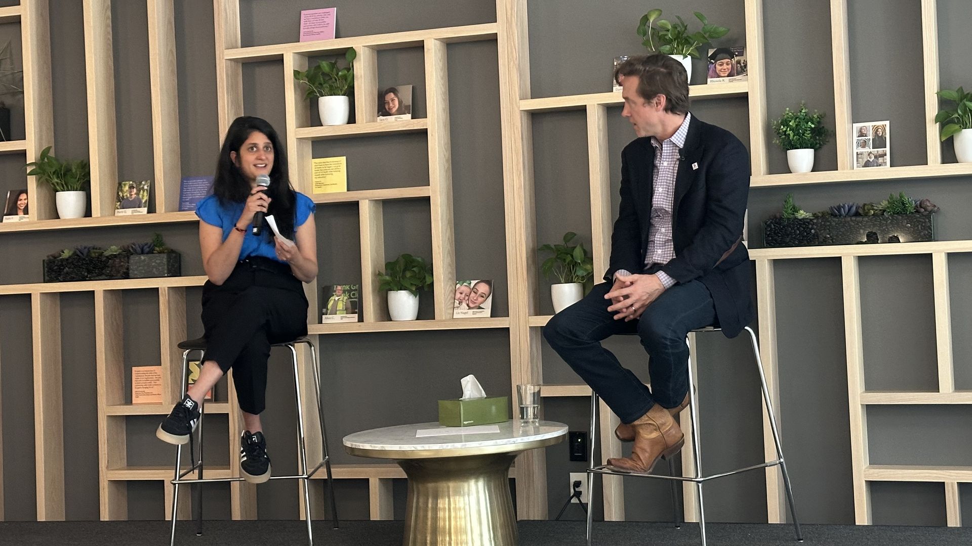 Guild CEO Bijal Shah, left, and Denver Mayor Mike Johnston discuss the state of downtown during a fireside chat at Guild's office in downtown Denver on Jan. 14. Photo: Alayna Alvarez/Axios