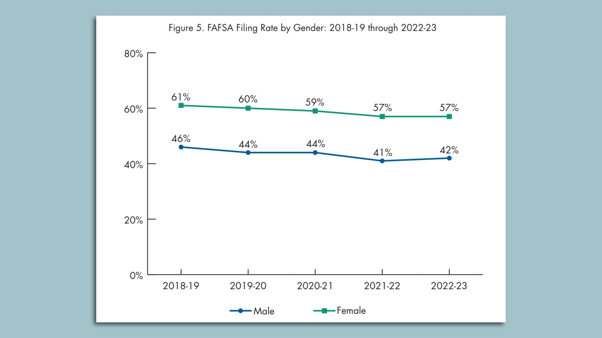 A chart showing FAFSA filings by males and females between 2018=19 and 2022-23. Chart courtesy of Iowa College Aid