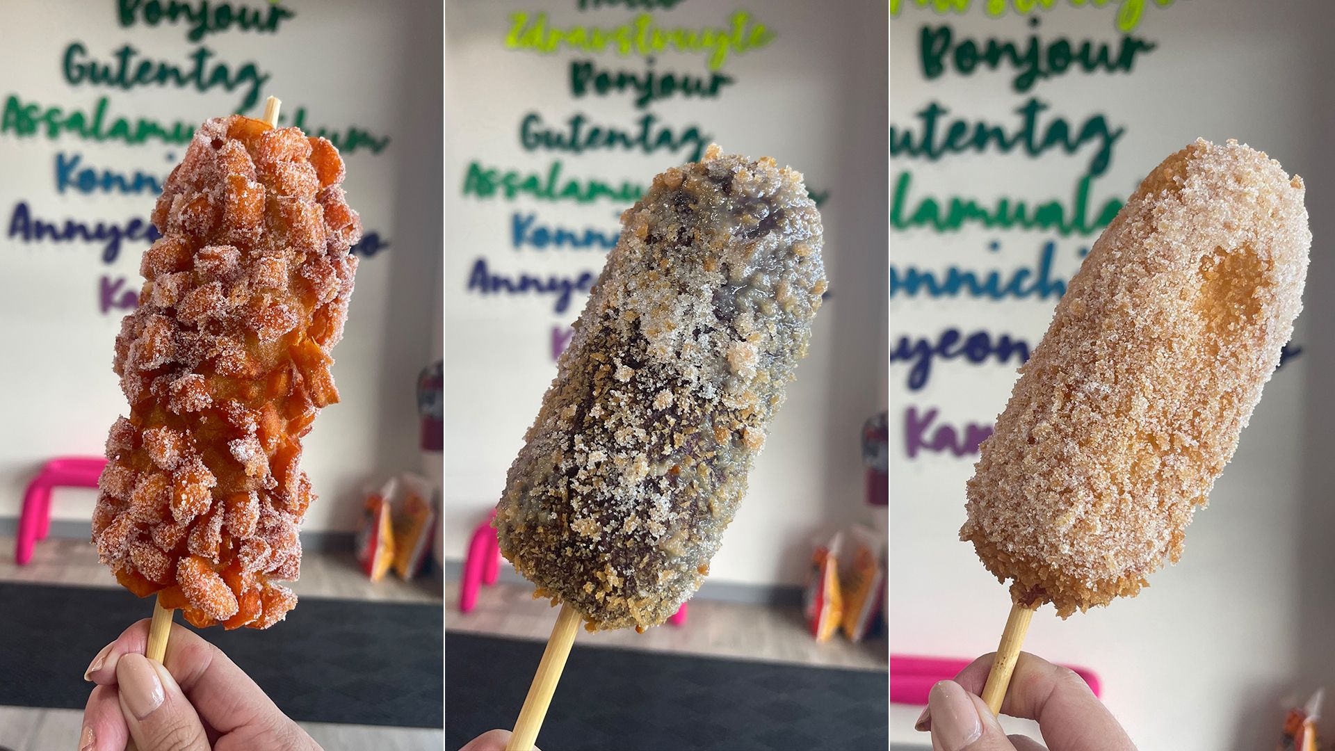 Sweet potato fries ($6.88), Ube ($6.48) and classic ($6.48) Korean corndogs ($6.88 each). Photos: Linh Ta/Axios