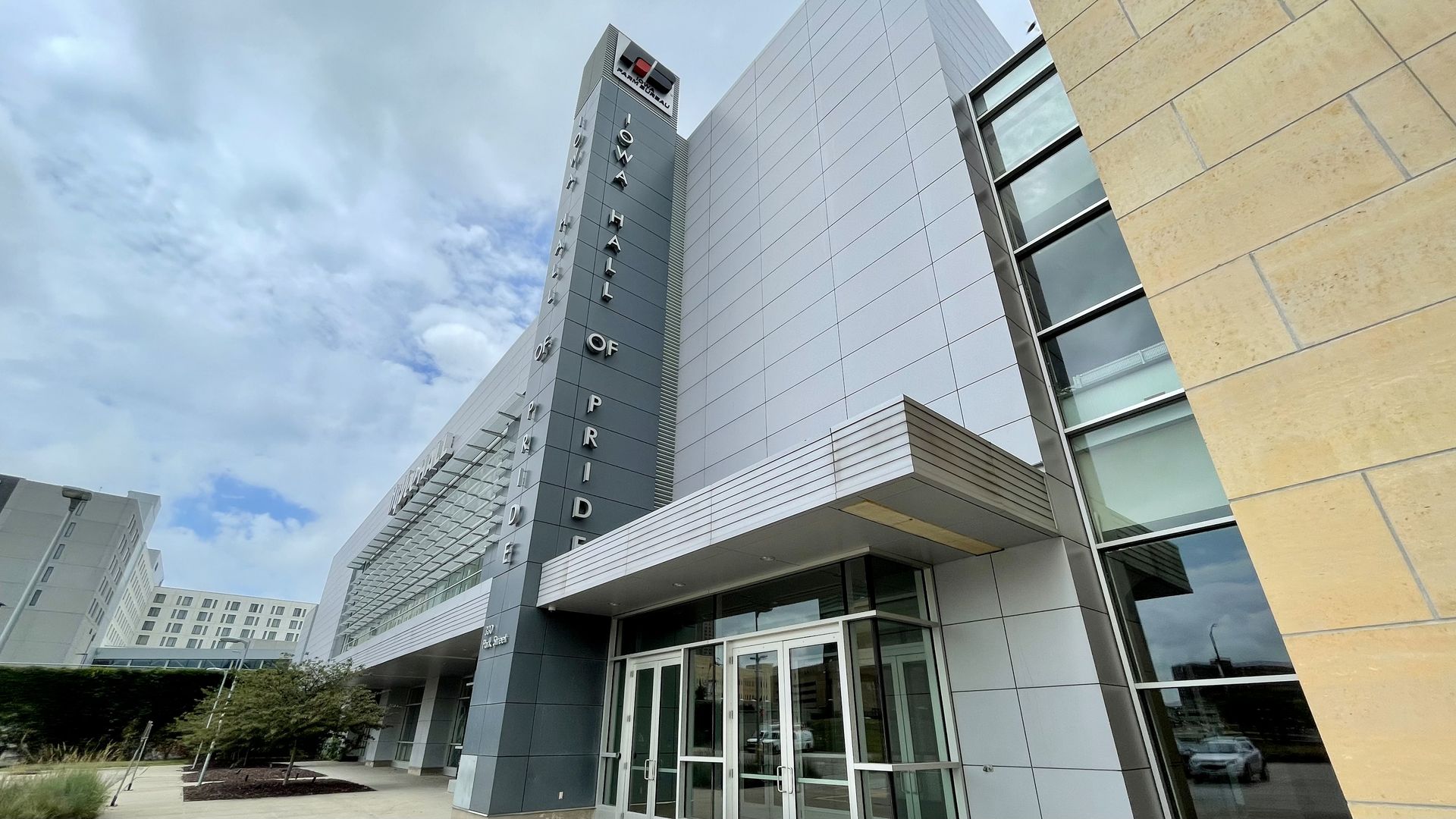The Iowa Hall of Pride lettering will be removed from the Iowa Events Center's exterior in coming months. Photo: Jason Clayworth/Axios