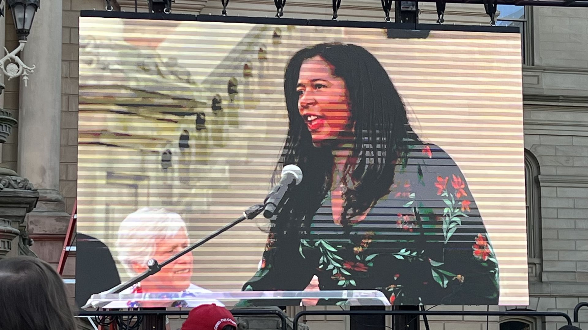 A large projector screen shows Republican Secretary of State candidate Kristina Karamo speaking at a rally in Lansing on Aug. 27 after the Michigan Republican Party nominating convention. Photo: Samuel Robinson/Axios