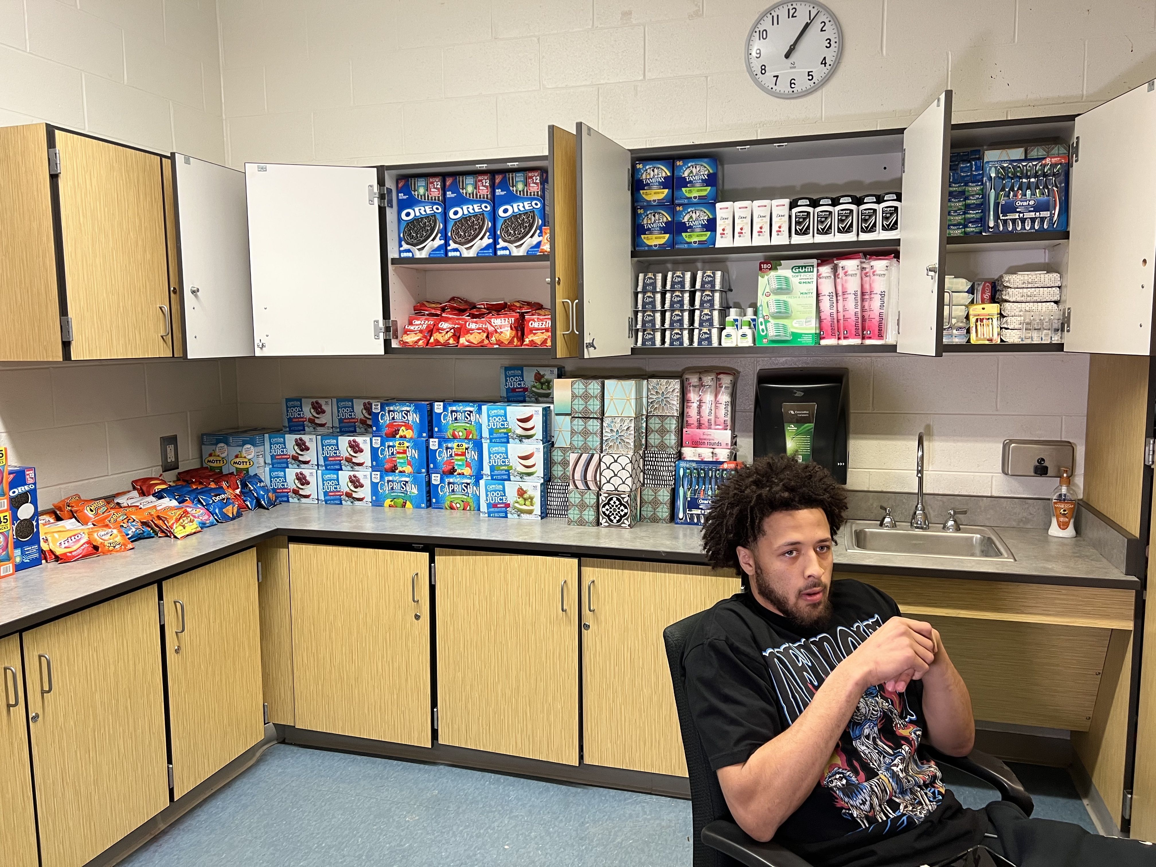 Pistons' Cade Cunningham and Saddiq Bey present their donations alongside students inside the Gompers Elementary/Middle School gymnasium. Photos: Samuel Robinson/Axios
