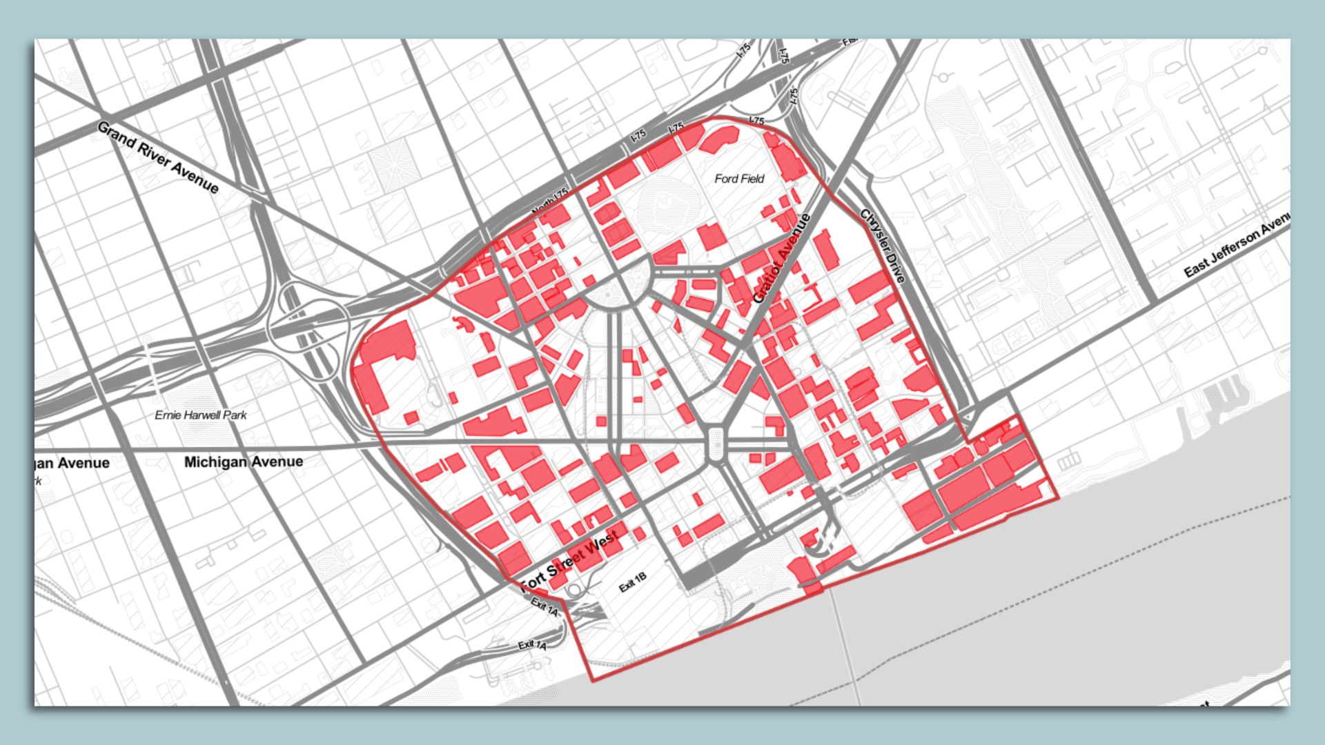 Areas of downtown Detroit covered in parking lots or garages are shown in red; Screenshot: Parking Reform Network