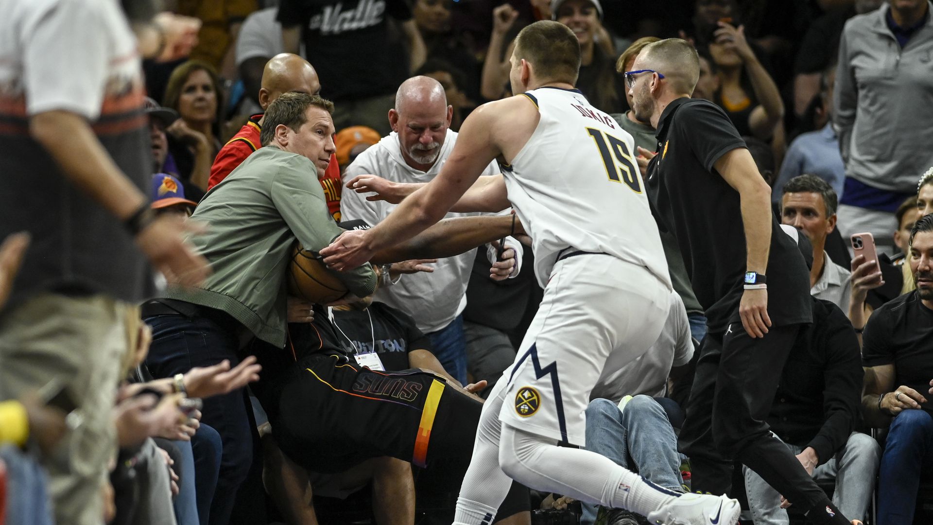 Nuggets star Nikola Jokić rushes to retrieve the game ball clutched by Phoenix Suns owner Mat Ishbia during Sunday's playoff game. Photo: AAron Ontiveroz/The Denver Post/Getty