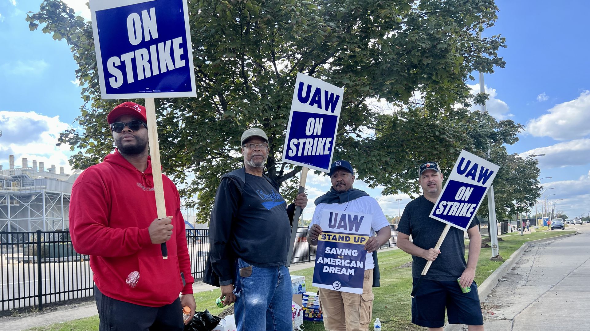 Striking workers stand outside Ford's Michigan Assembly Plant on Friday, Sept. 15. Photo: Samuel Robinson/Axios